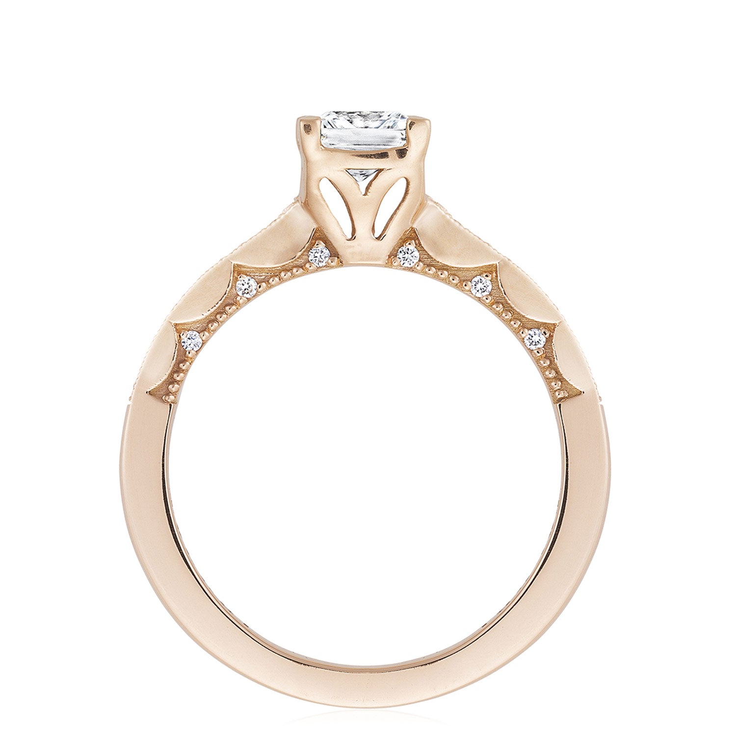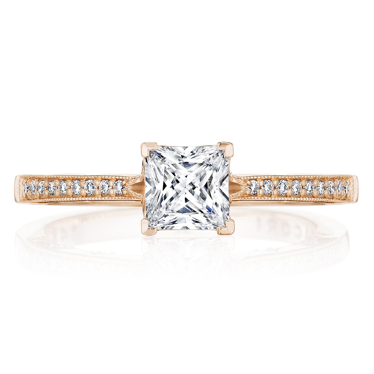 Dainty and sweet, a princess cut diamond solitaire rests gently on a diamond band, with the Coastal Crescent inner face with pinpoint diamond details for a truly regal look.