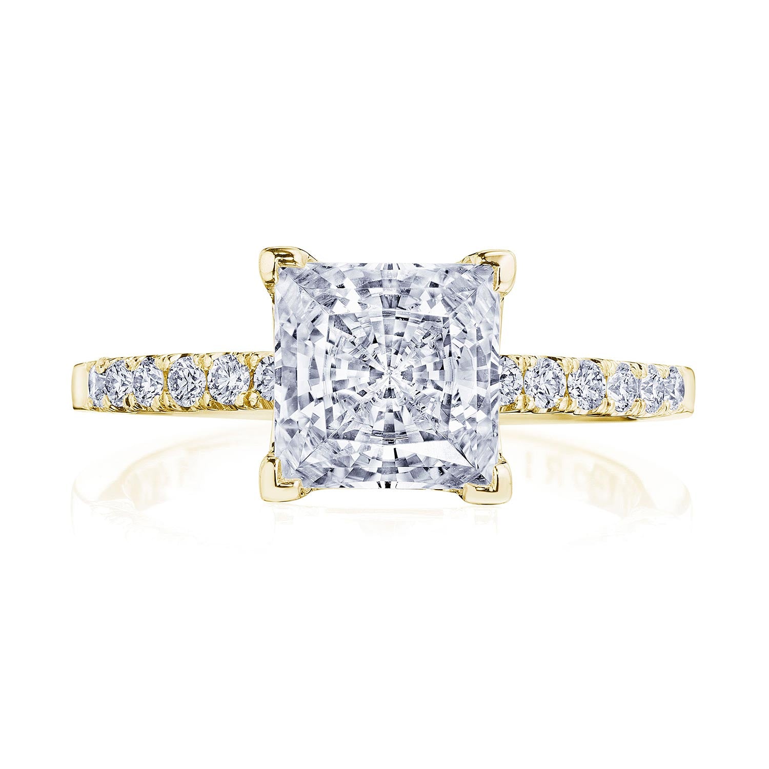 Less metal, means more scene-stealing diamond action. A princess cut diamond solitaire rests gently on a diamond band with french pavé, revealing more diamond than metal. This ring features the Coastal Crescent inner face with pinpoint diamond details for a truly regal look.