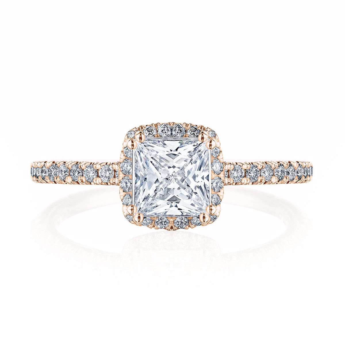 A thin, Simply Tacori Classic 360 foundation that delivers brilliant detail, crowned with a princess cut center and cushion shaped bloom. Truly Tacori and totally lovely.