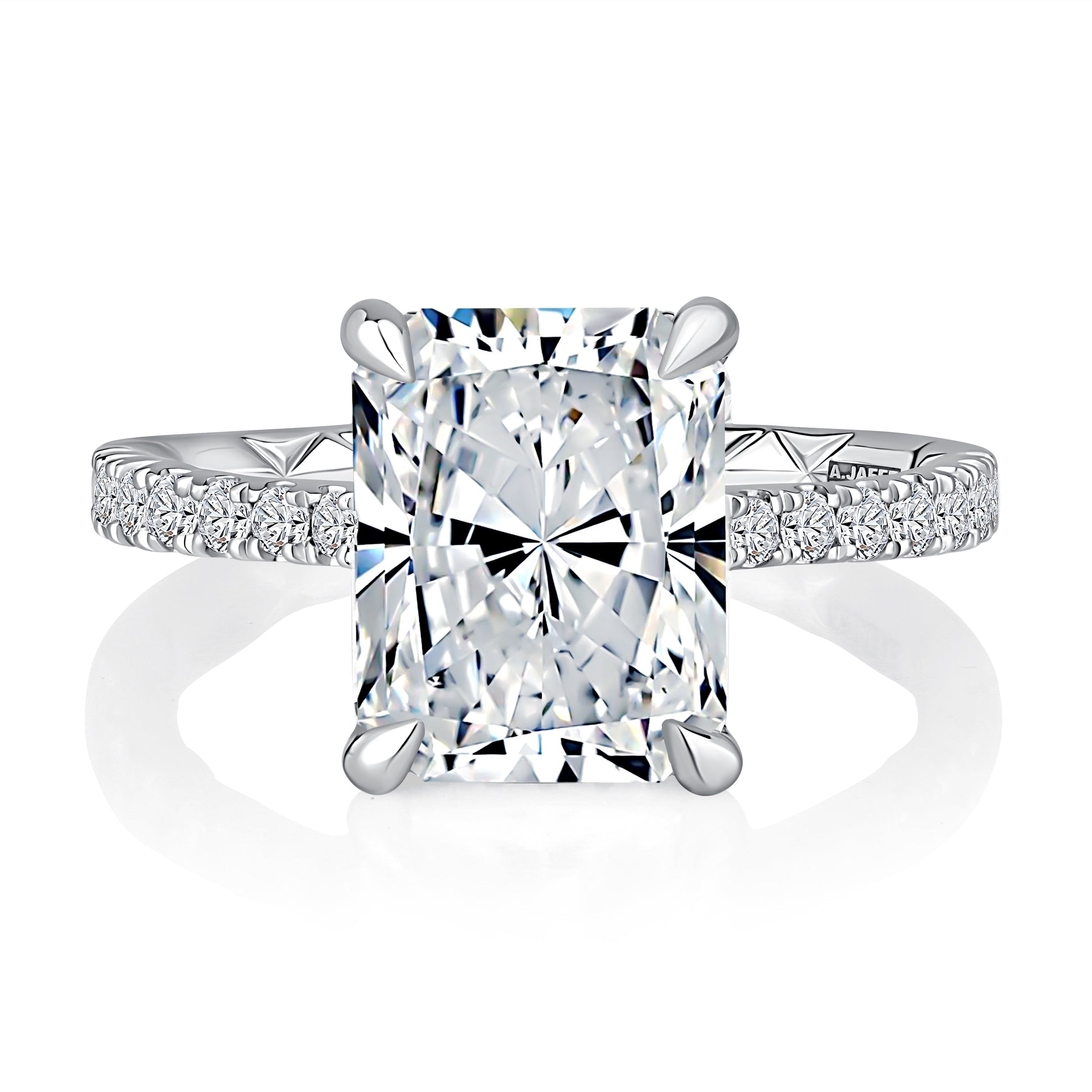 This radiant-shaped diamond engagement ring features a stunning radiant center stone, complemented by a hidden halo that enhances its brilliance. The Quilts® interior ensures a refined fit, while the diamond band adds an extra layer of elegance. A perfect blend of modernn sophistication and timeless appeal, this ring is a symbol of lasting love.