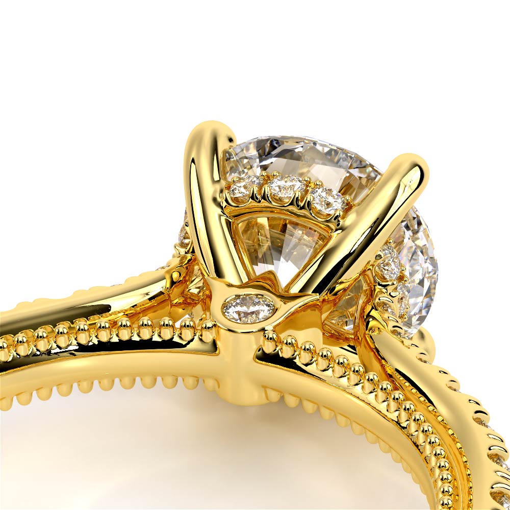 Renaissance-992R1.7 A classic four-prong engagement ring where timeless elegance meets contemporary flair. A unique diamond bridge elevates the center stone for added brilliance and the diamond-studded cathedral shank, featuring subtle milgrain detail, gives a touch of vintage charm. The Verragio signature crest completes the balance of classic and modern.