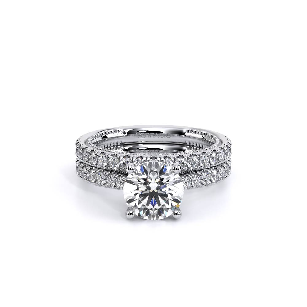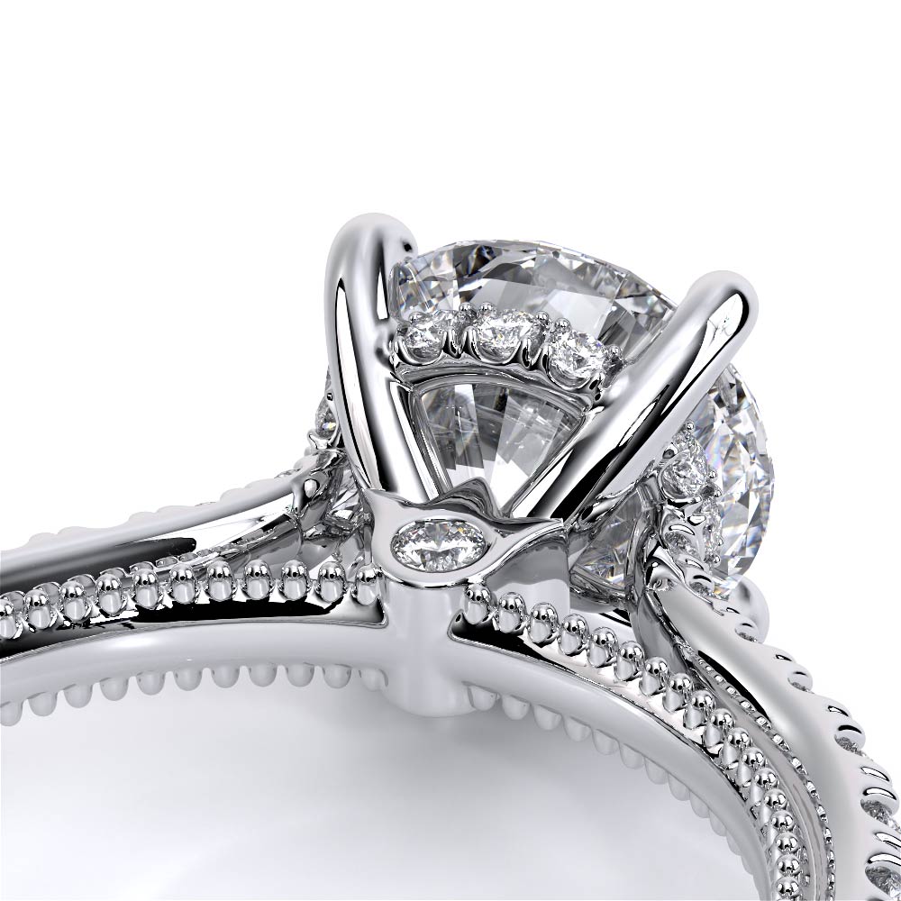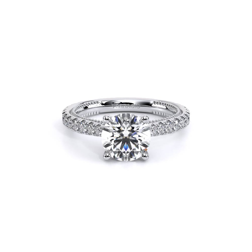 Renaissance-992R1.7 A classic four-prong engagement ring where timeless elegance meets contemporary flair. A unique diamond bridge elevates the center stone for added brilliance and the diamond-studded cathedral shank, featuring subtle milgrain detail, gives a touch of vintage charm. The Verragio signature crest completes the balance of classic and modern.
