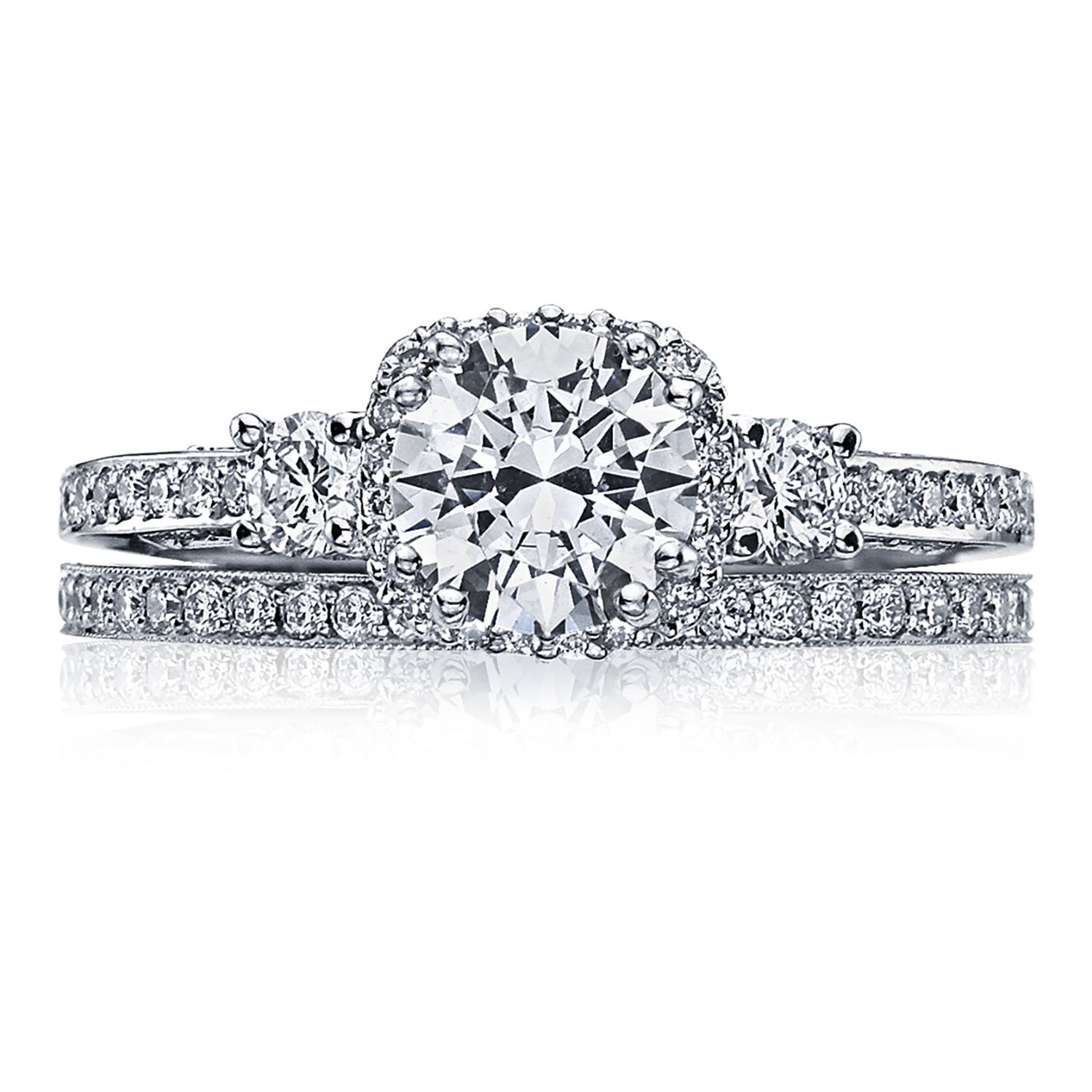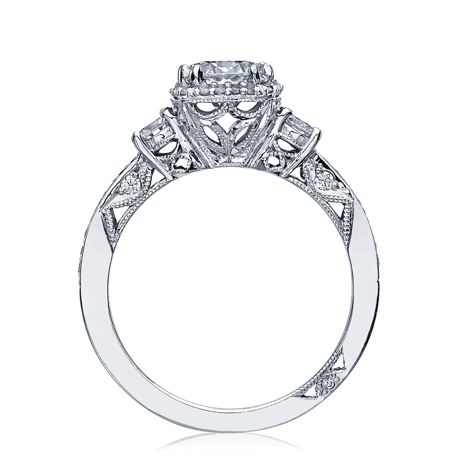 Glamorous and elegant, this three-stone Dantela ring triples the shimmer with a crown of diamonds intensifying the round center diamond. Signature Tacori details decorate the band for prettiness in every dimension.