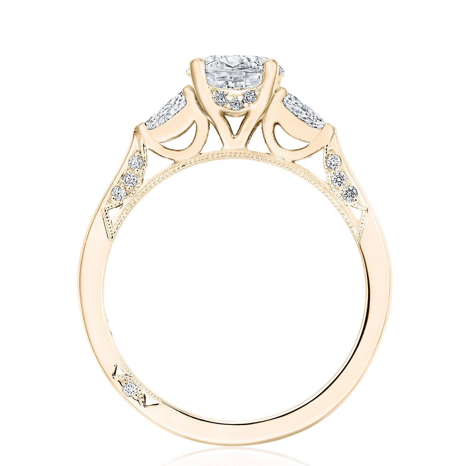 Let your diamond engagement ring stand out by contrasting your side stones with your center diamond! Pear-shaped side stones graduate to the round center, bringing a magical contrast to bring about beauty from every angle.