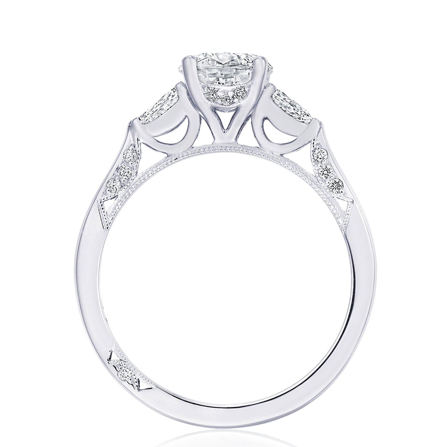 Let your diamond engagement ring stand out by contrasting your side stones with your center diamond! Pear-shaped side stones graduate to the round center, bringing a magical contrast to bring about beauty from every angle.
