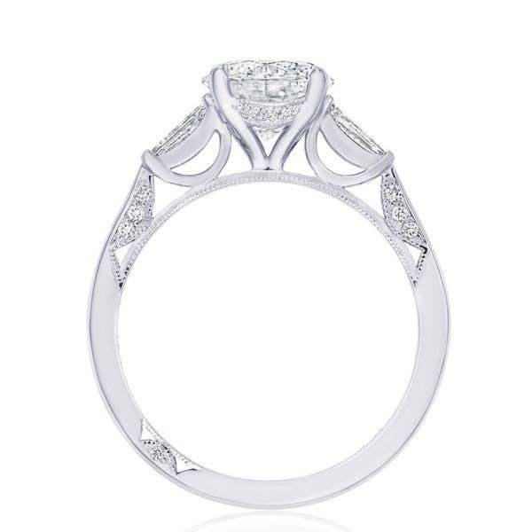 Let your diamond engagement ring stand out by contrasting your side stones with your center diamond! Baguette side stones graduate to the round center, bringing a magical contrast to bring about beauty from every angle.