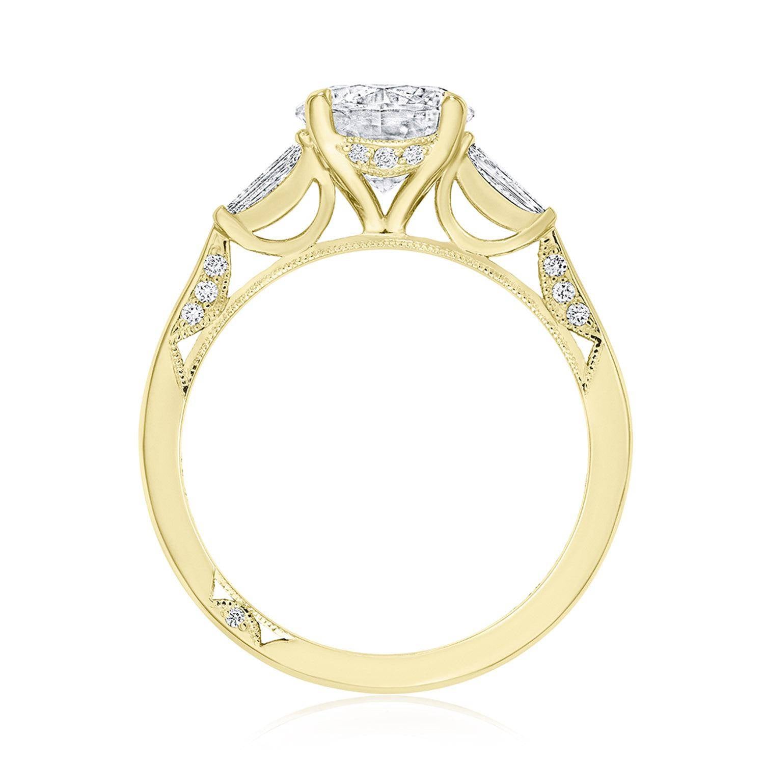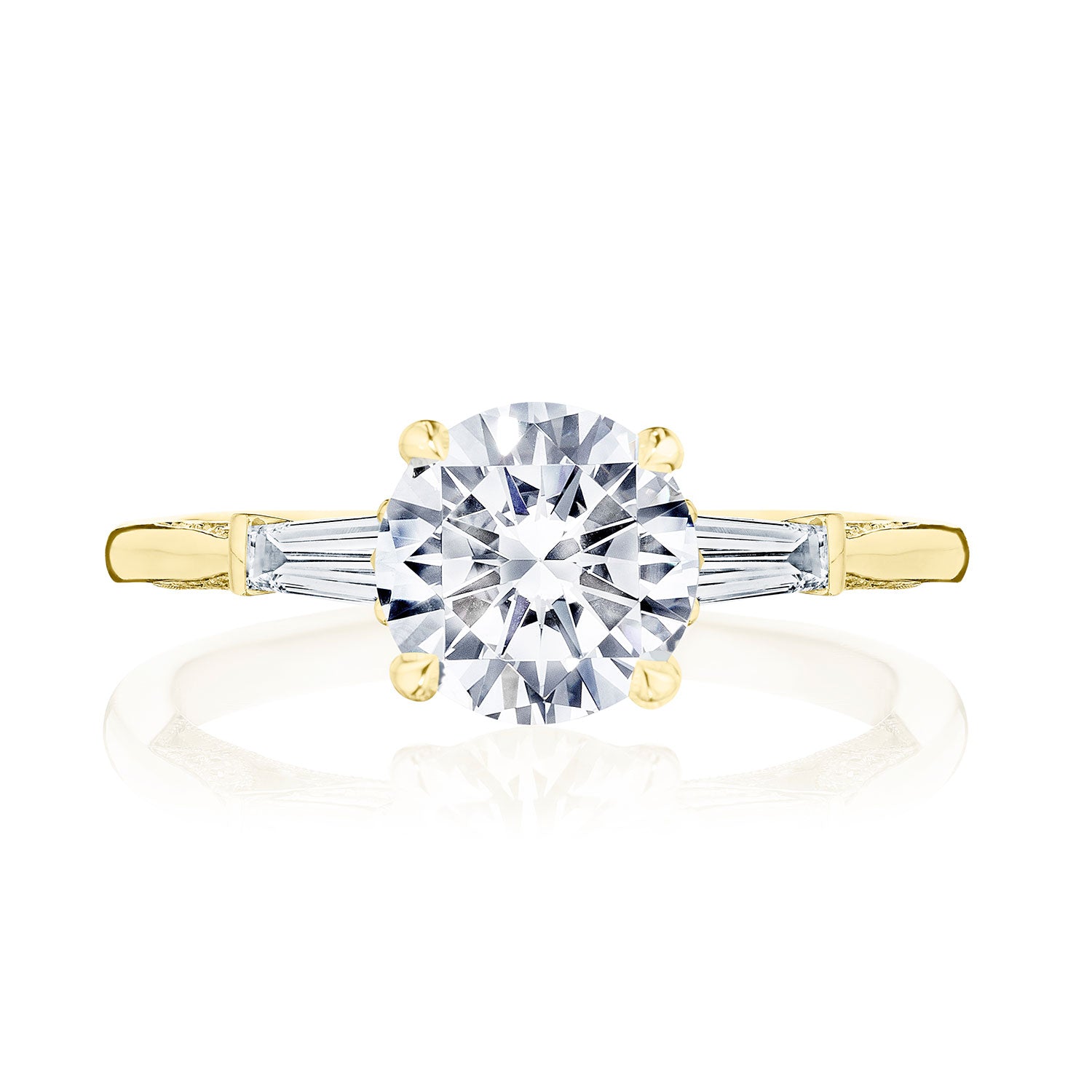 Let your diamond engagement ring stand out by contrasting your side stones with your center diamond! Baguette side stones graduate to the round center, bringing a magical contrast to bring about beauty from every angle.