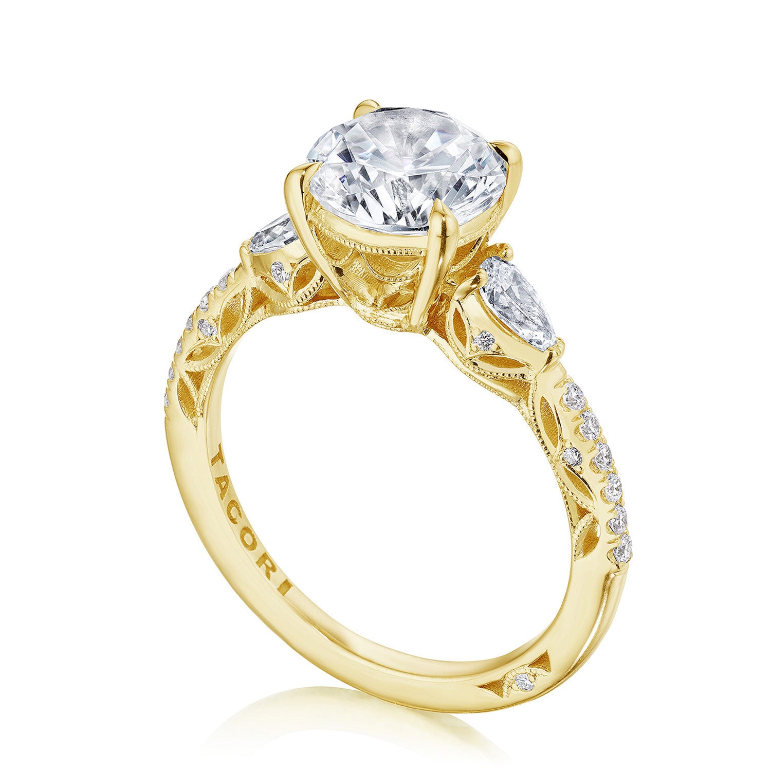 This three stone ring features distinctive pear side stones that sit atop a lace-like crown and foundation of complex, milgrain-edged Dantela Crescent Fabric. Meticulous, hand-set French pavé leads up the ceiling for eye-catching brilliance.