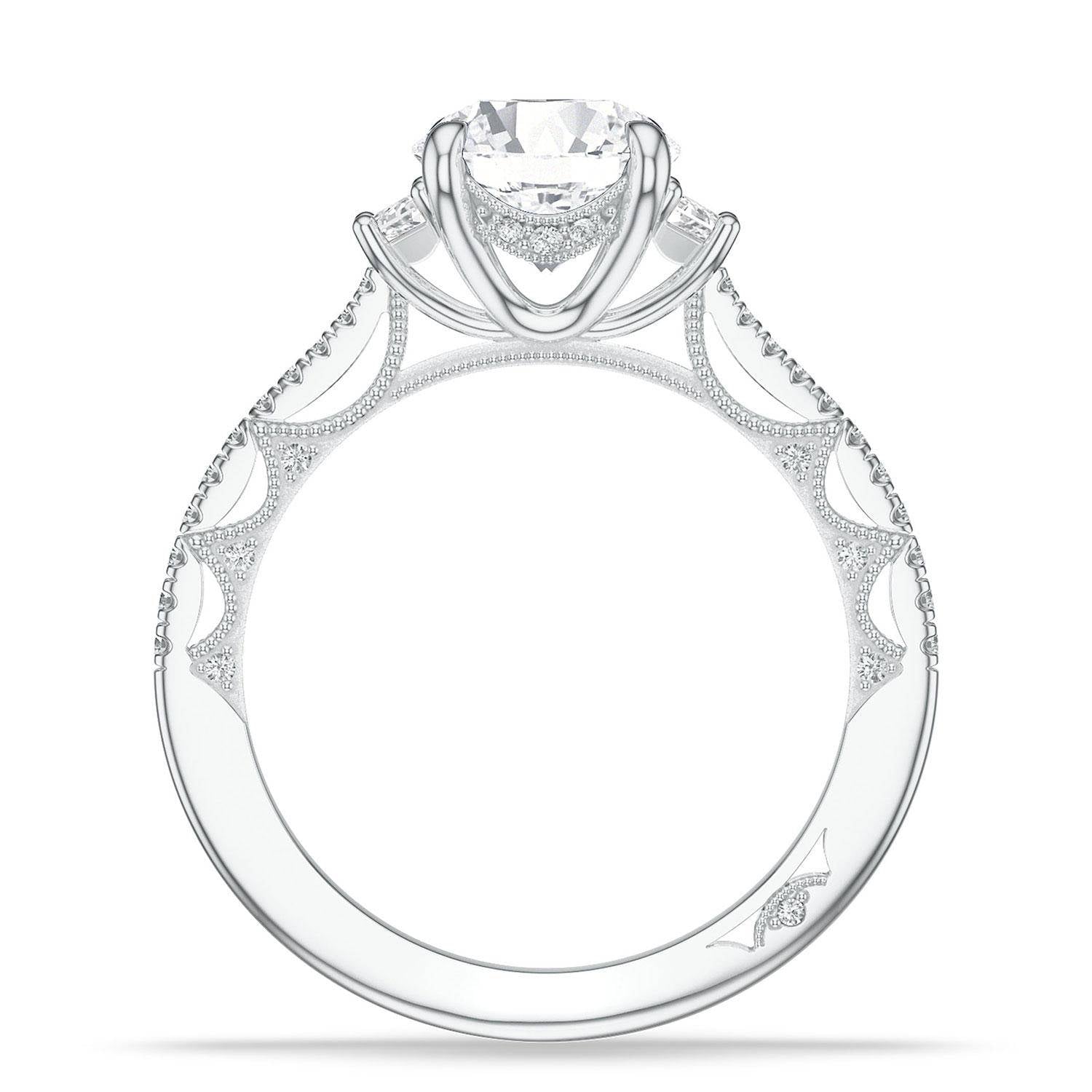 Milgrain-edged Crescents create radiant windows of light, while round-brilliant diamonds at each Crescent junction are hand-set with triple beading. A pave ceiling leads towards the three-stone crown with a hidden bloom.