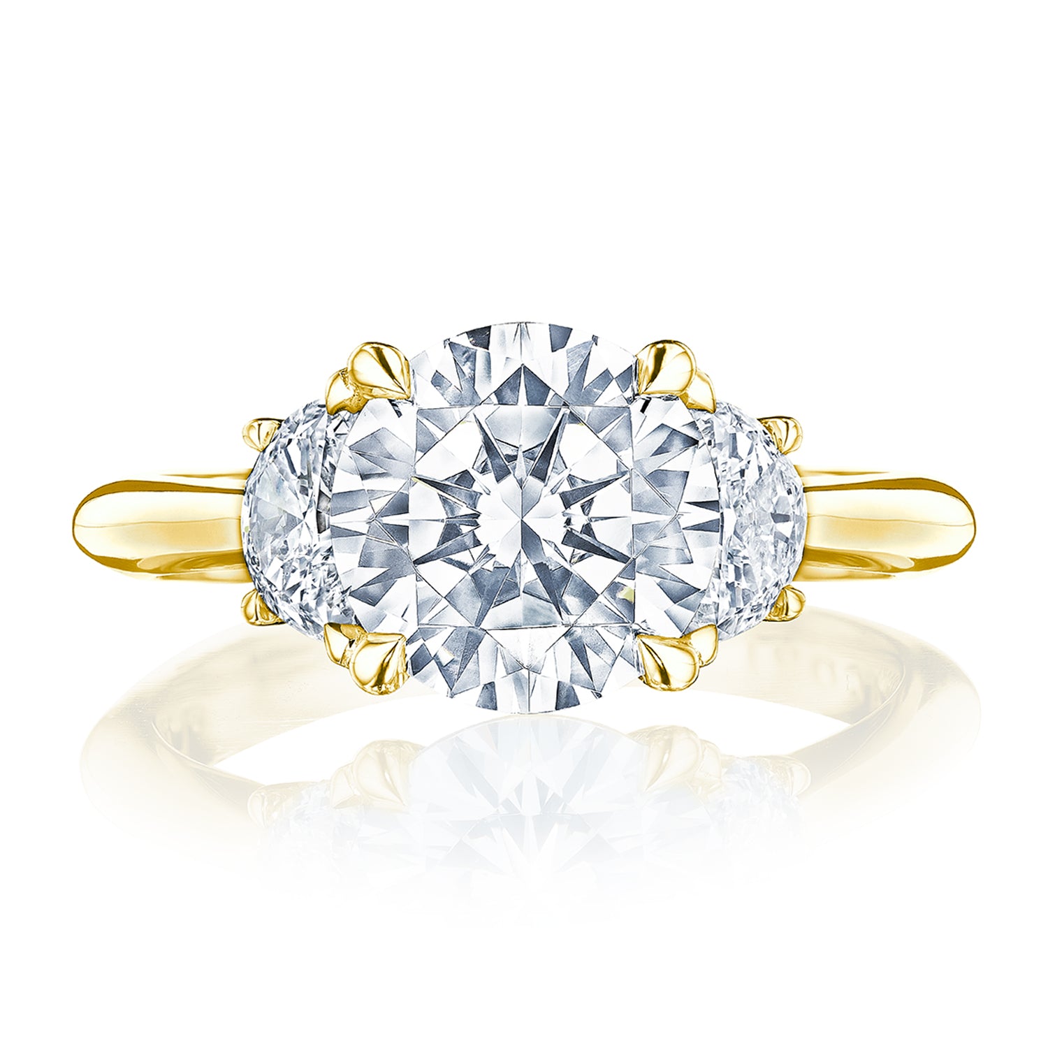Designed by our Founder, Haig Tacorian, this 3-stone ring on a high-polished band features two half-moon side stones that embrace the round-brilliant cut center. Discover the diamond-intense Tacori crescent signature.