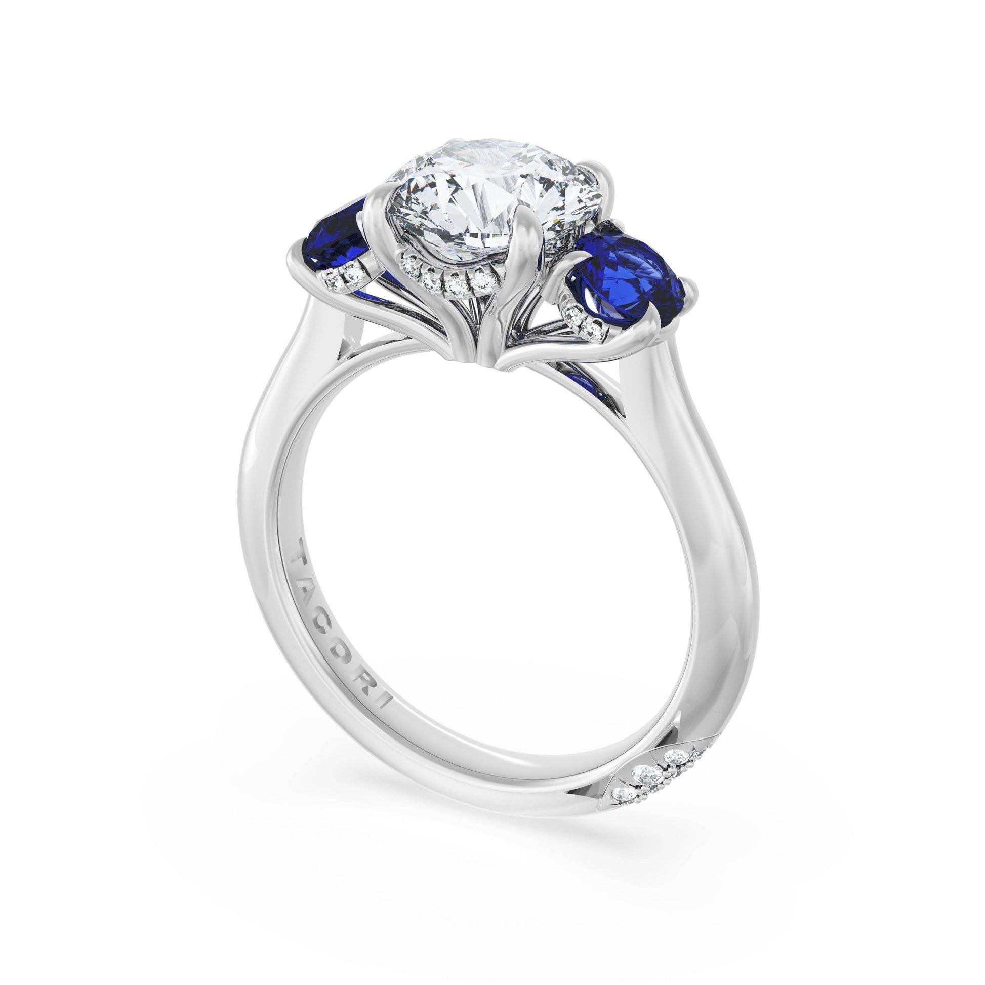 This 3-stone ring on a high polish band features a round brilliant center and matching round side stones in blue sapphire, each accented with a hidden bloom. The ring is finished with a diamond-studded Signature Crescent.