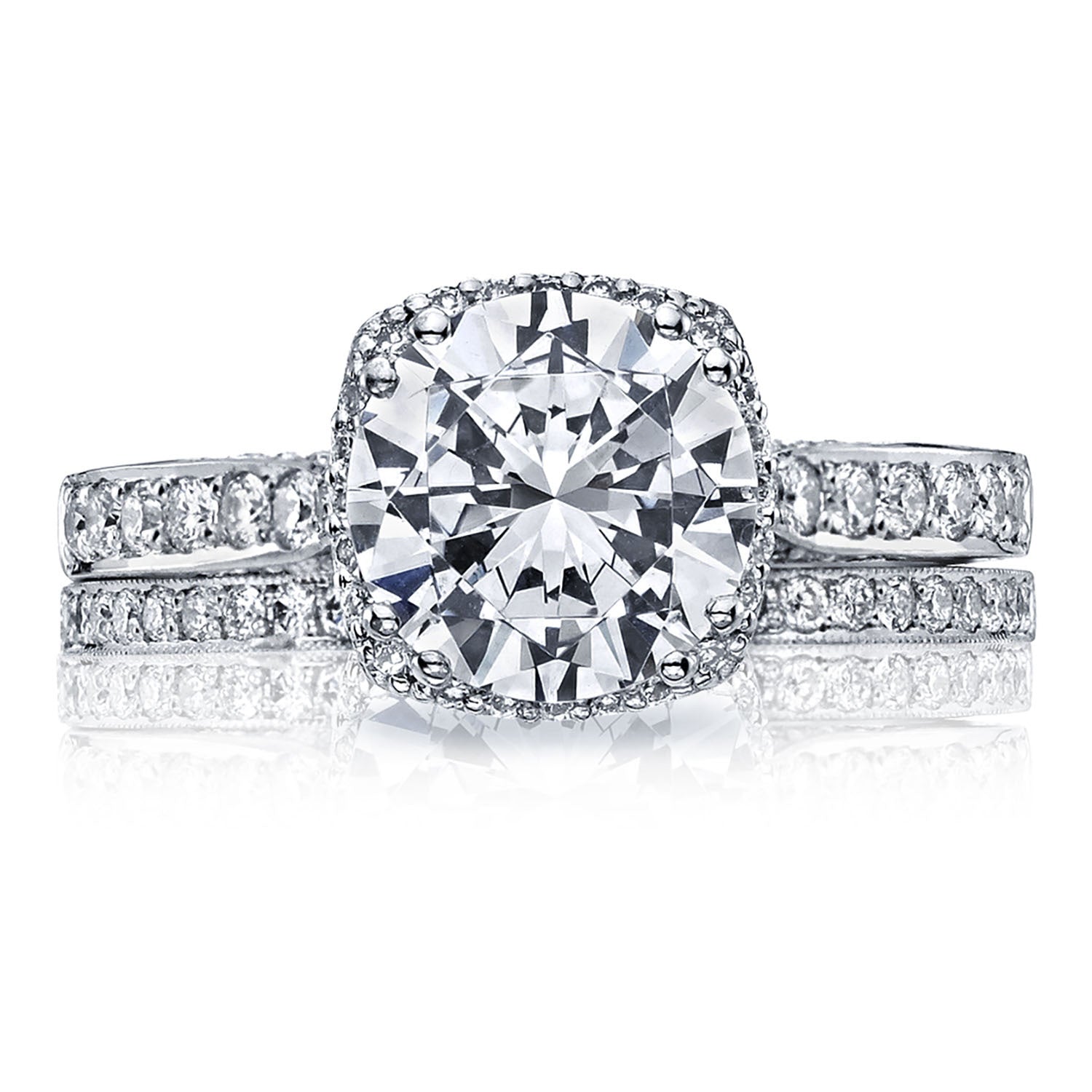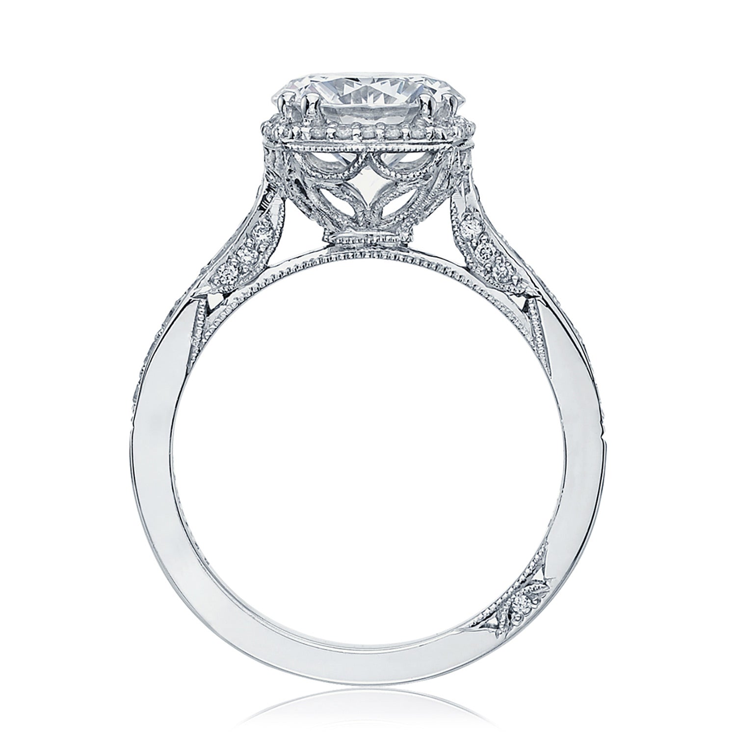 From our Dantela Collection, this unique setting creates a look that is a beautiful juxtaposition of modern, yet traditional; classic, yet unconventional. High polished platinum and a "blooming" crown of spotlight enhancers add depth and dimension to this stunning engagement ring.
