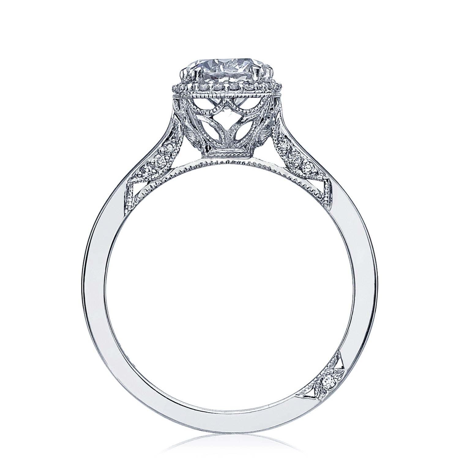 From our Dantela Collection, this unique setting creates a look that is a beautiful juxtaposition of modern, yet traditional; classic, yet unconventional. High polished platinum and a "blooming" crown of spotlight enhancers add depth and dimension to this stunning engagement ring.