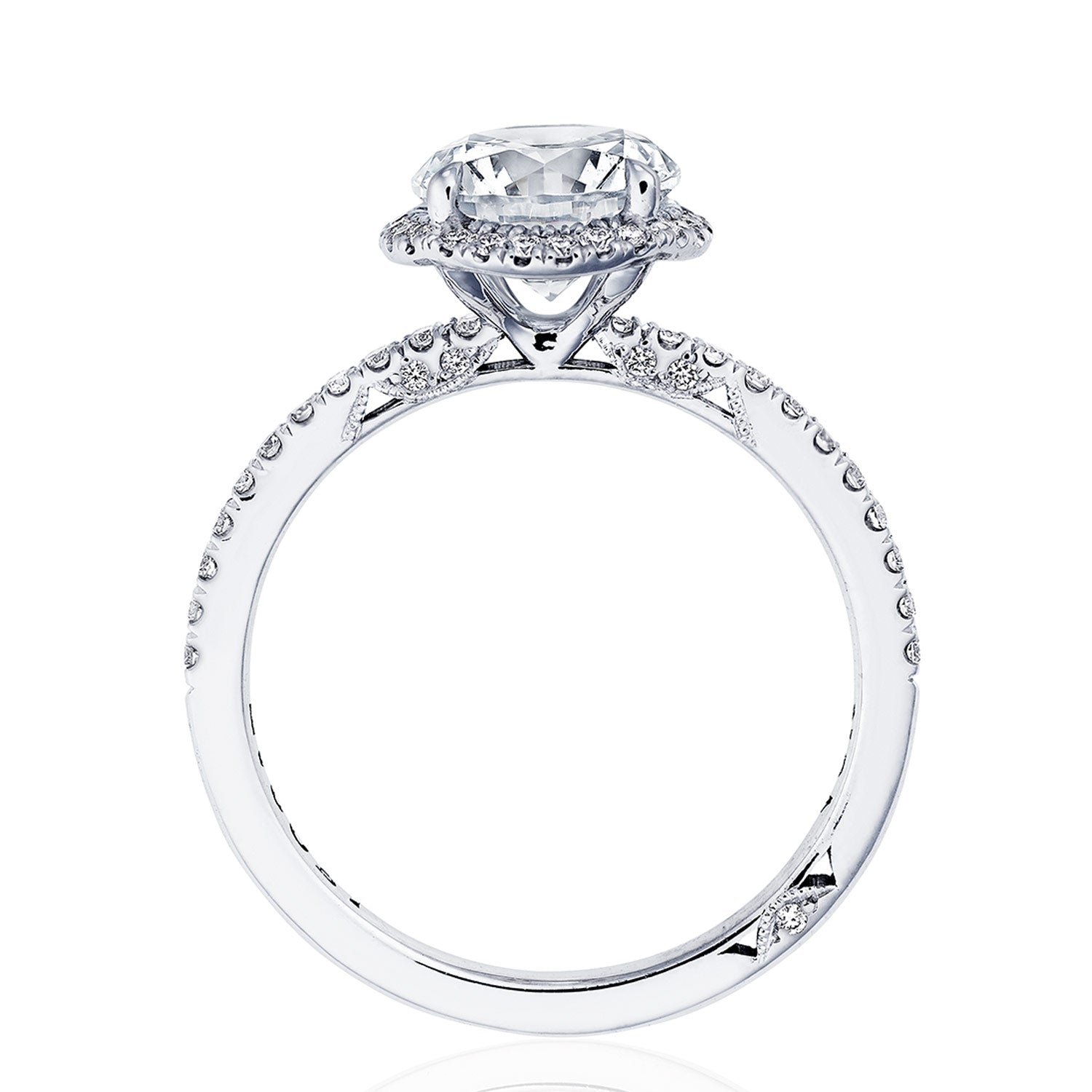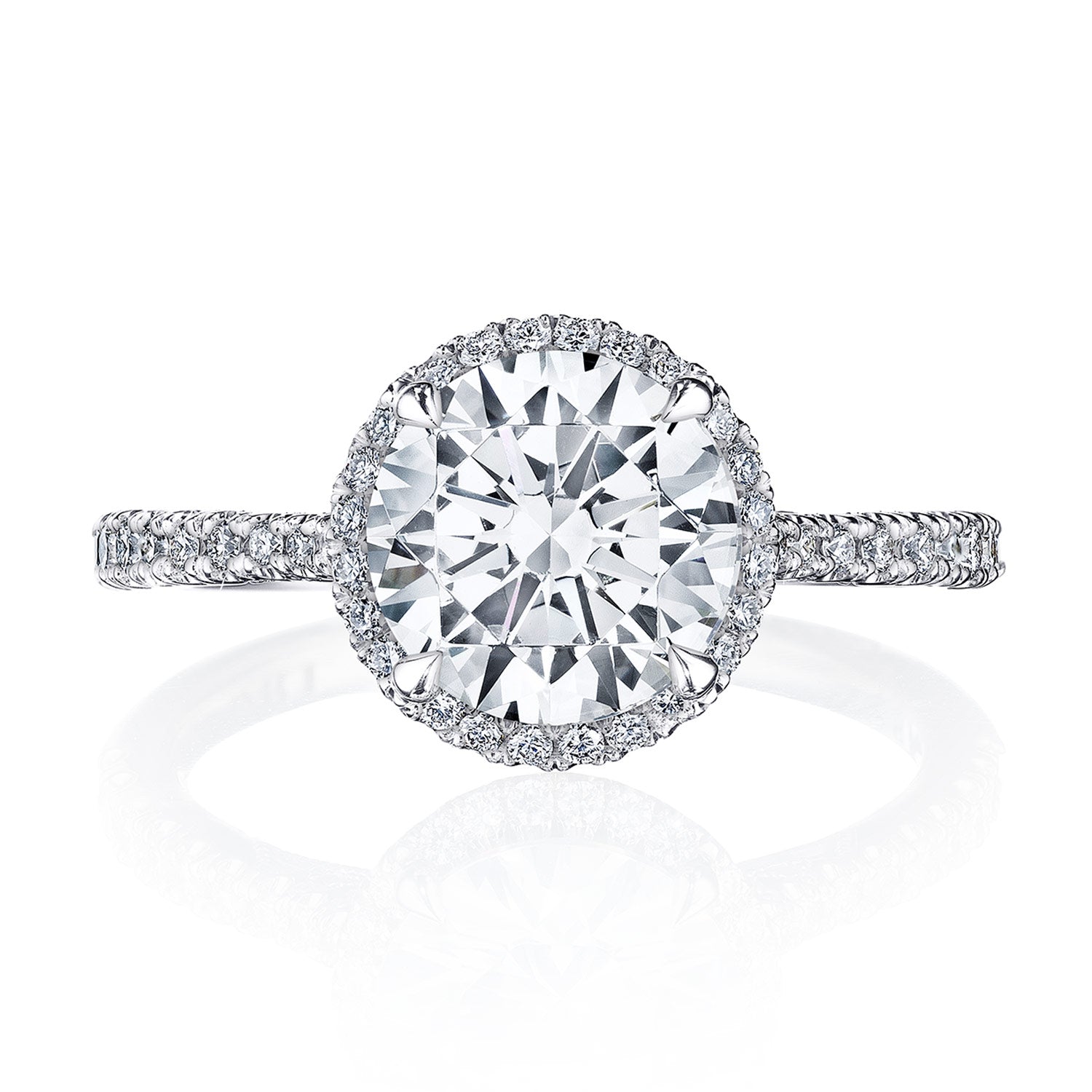 A thin, Simply Tacori Classic 360 foundation that delivers brilliant detail, crowned with a round brilliant cut center and round shaped bloom. Truly Tacori and totally lovely.
