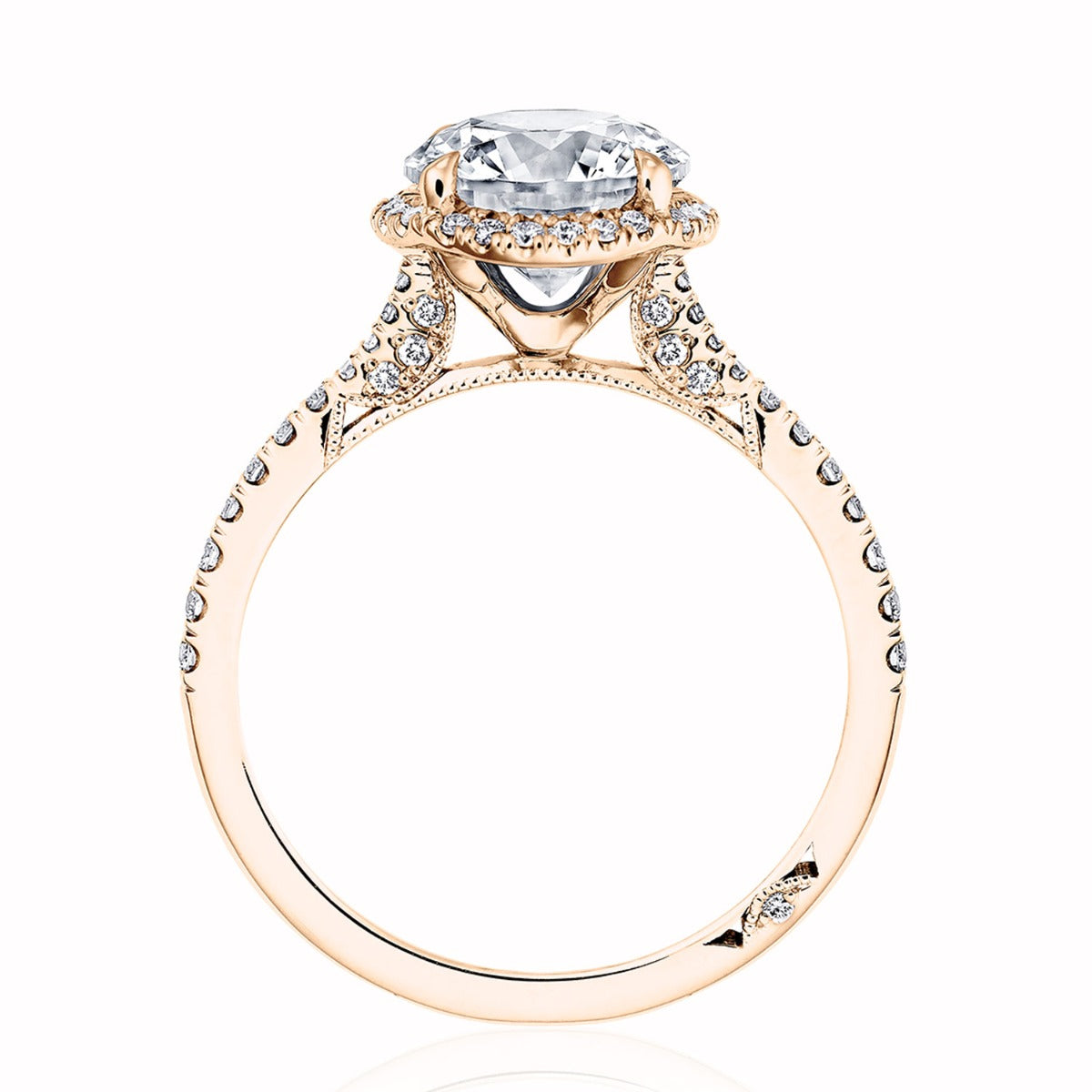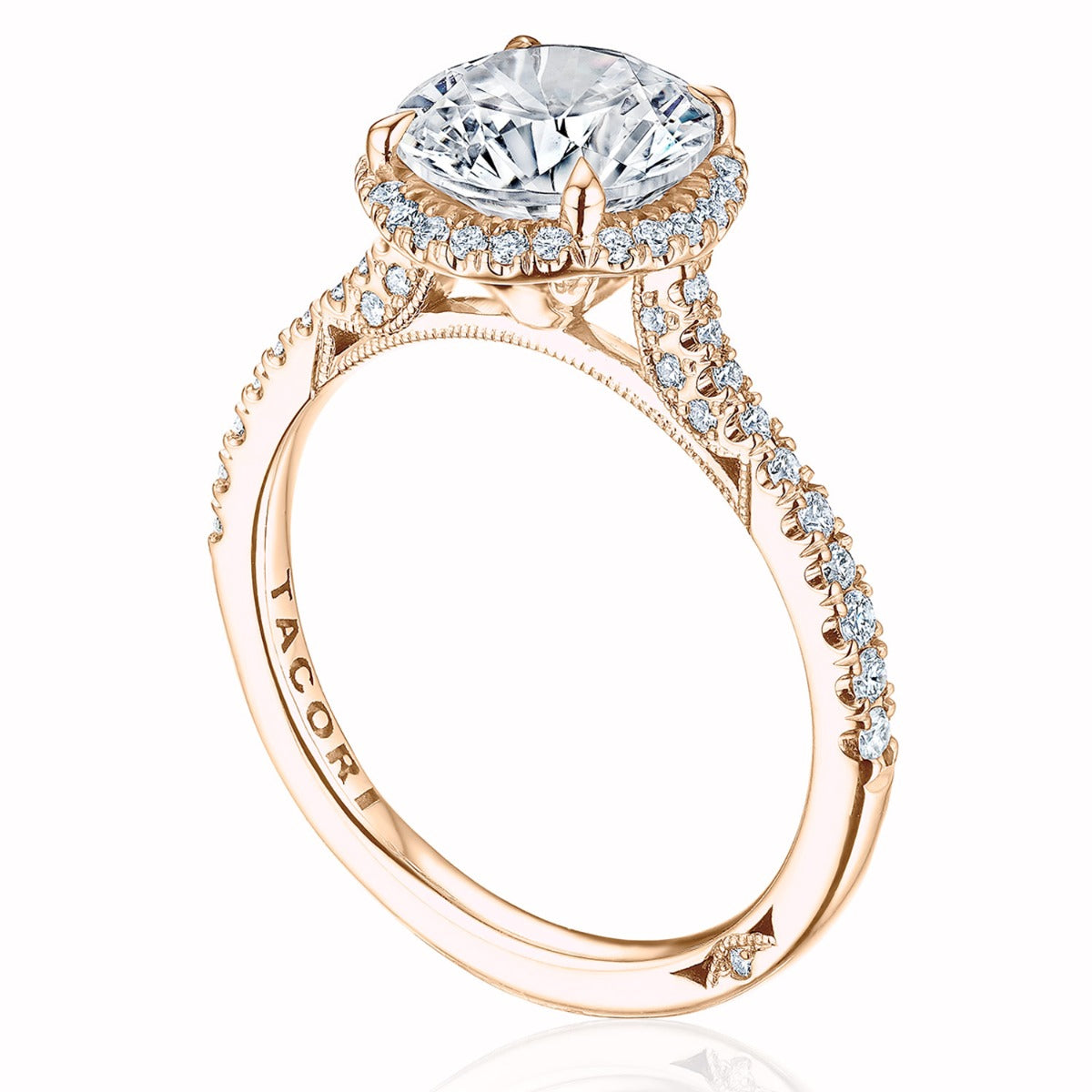 A thin, Simply Tacori Cathedral foundation that delivers brilliant detail, crowned with a round brilliant cut center and round shaped bloom. Truly Tacori and totally lovely.