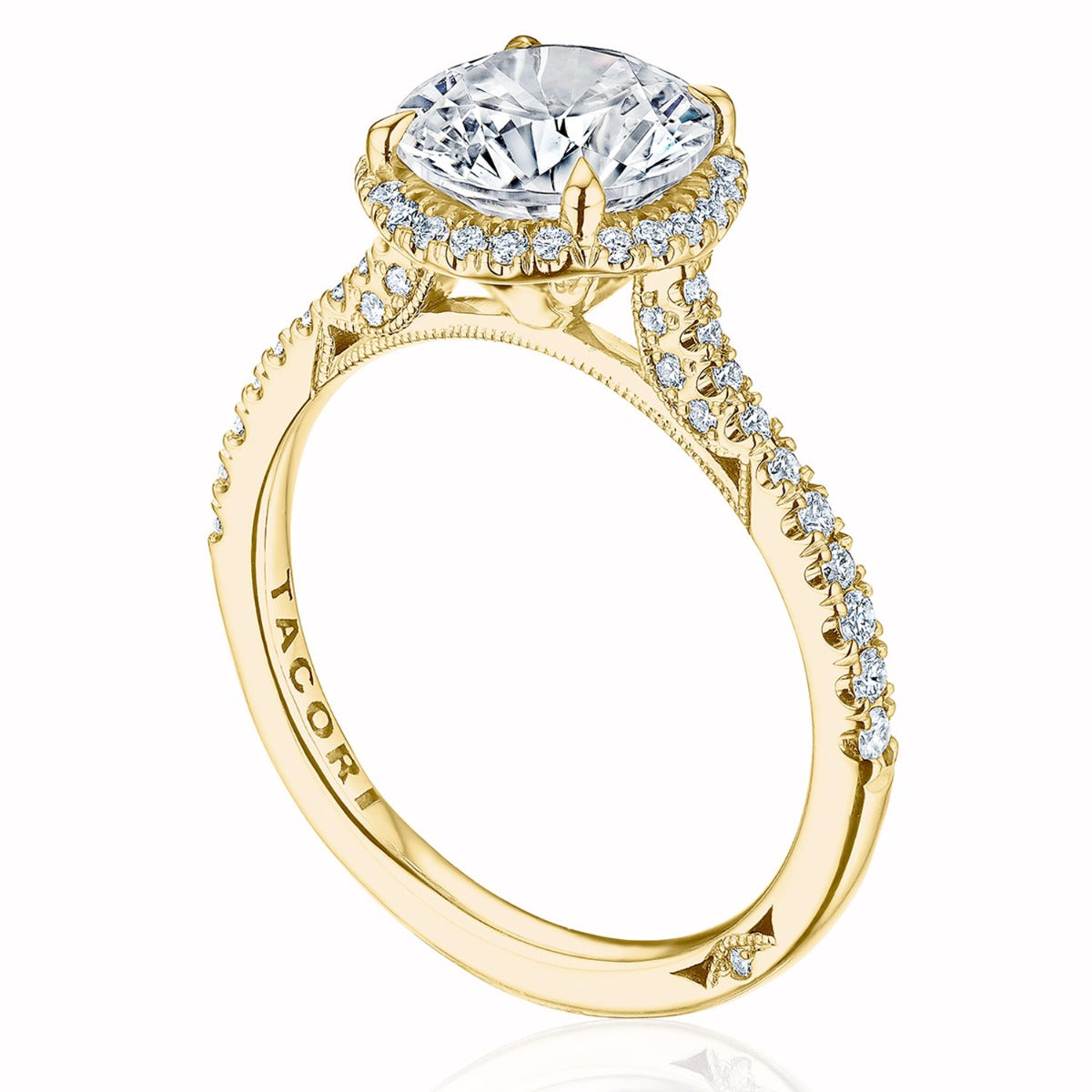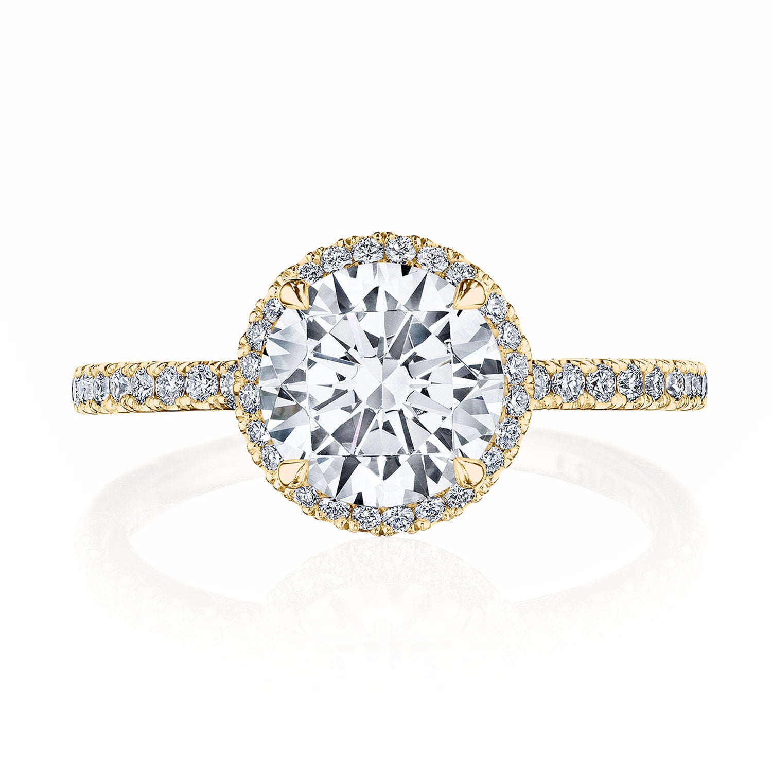 A thin, Simply Tacori Cathedral foundation that delivers brilliant detail, crowned with a round brilliant cut center and round shaped bloom. Truly Tacori and totally lovely.