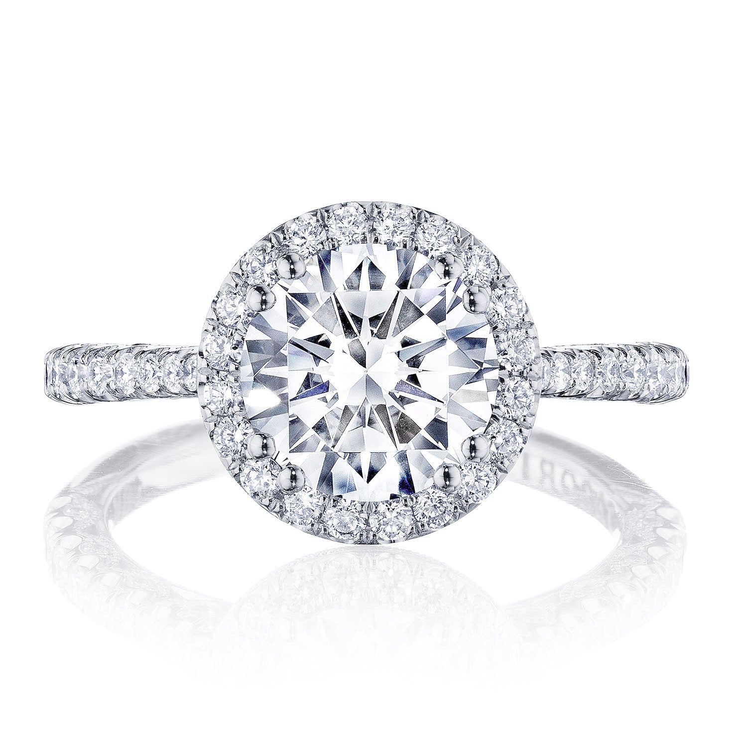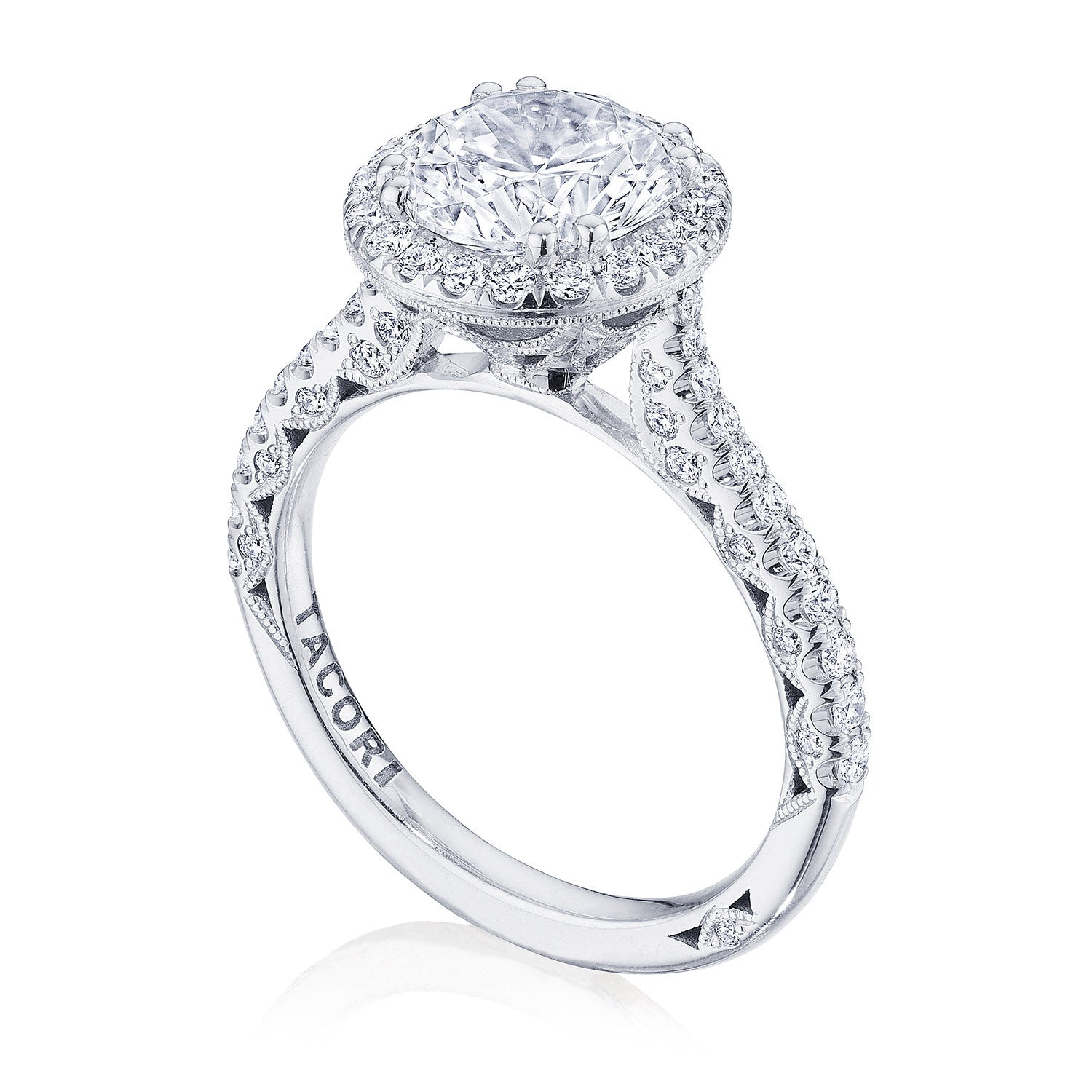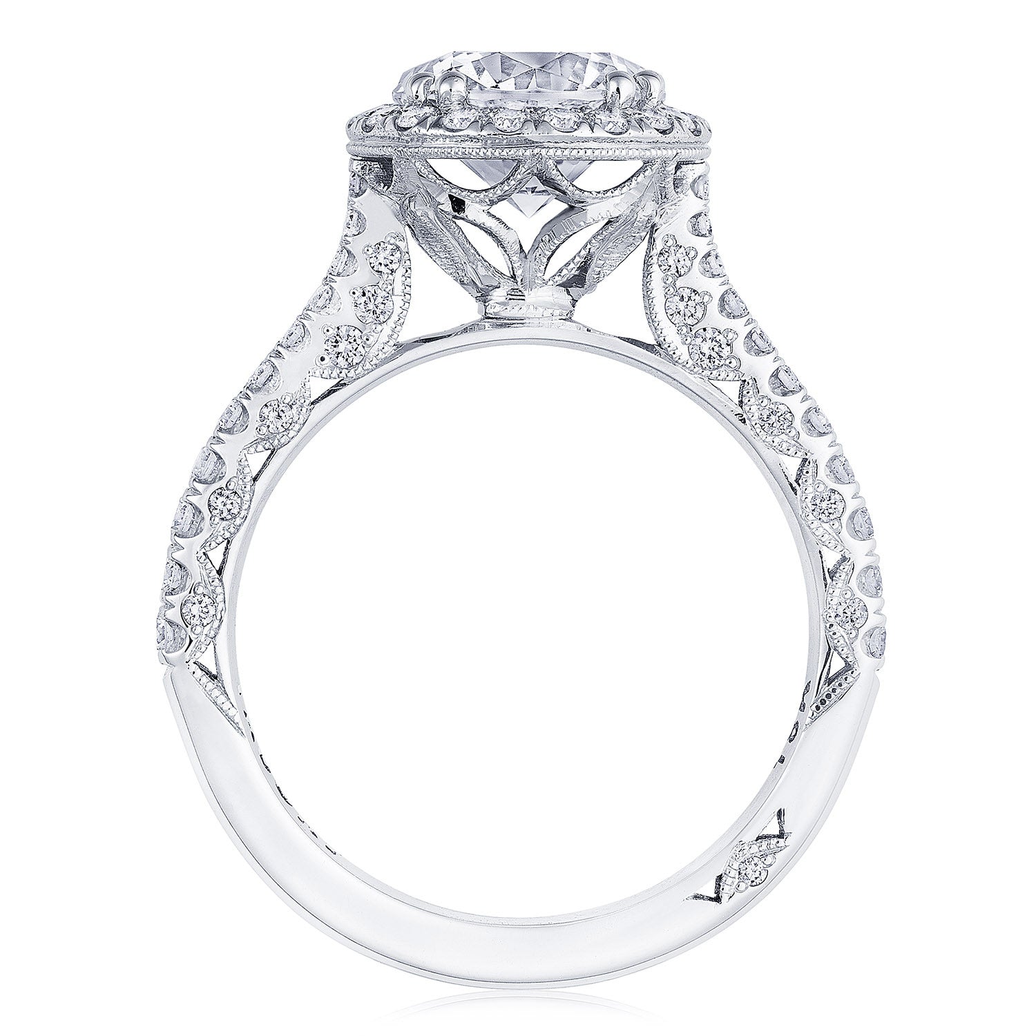 A diamond-intense Petite Crescent foundation with a lace-like Dantela crown and round bloom. Graduating diamonds on the band taper towards the center, adding the perfect touch of classic elegance.