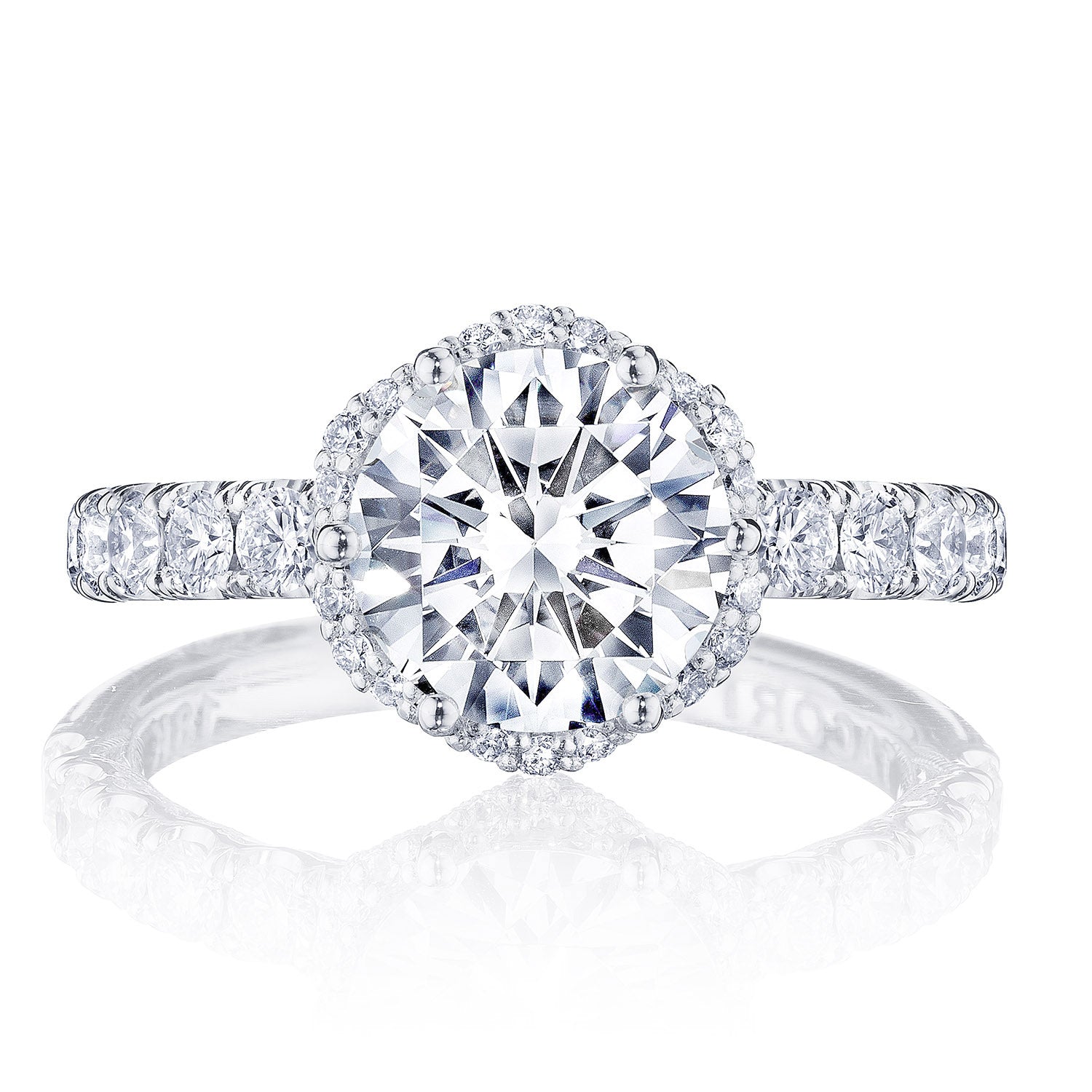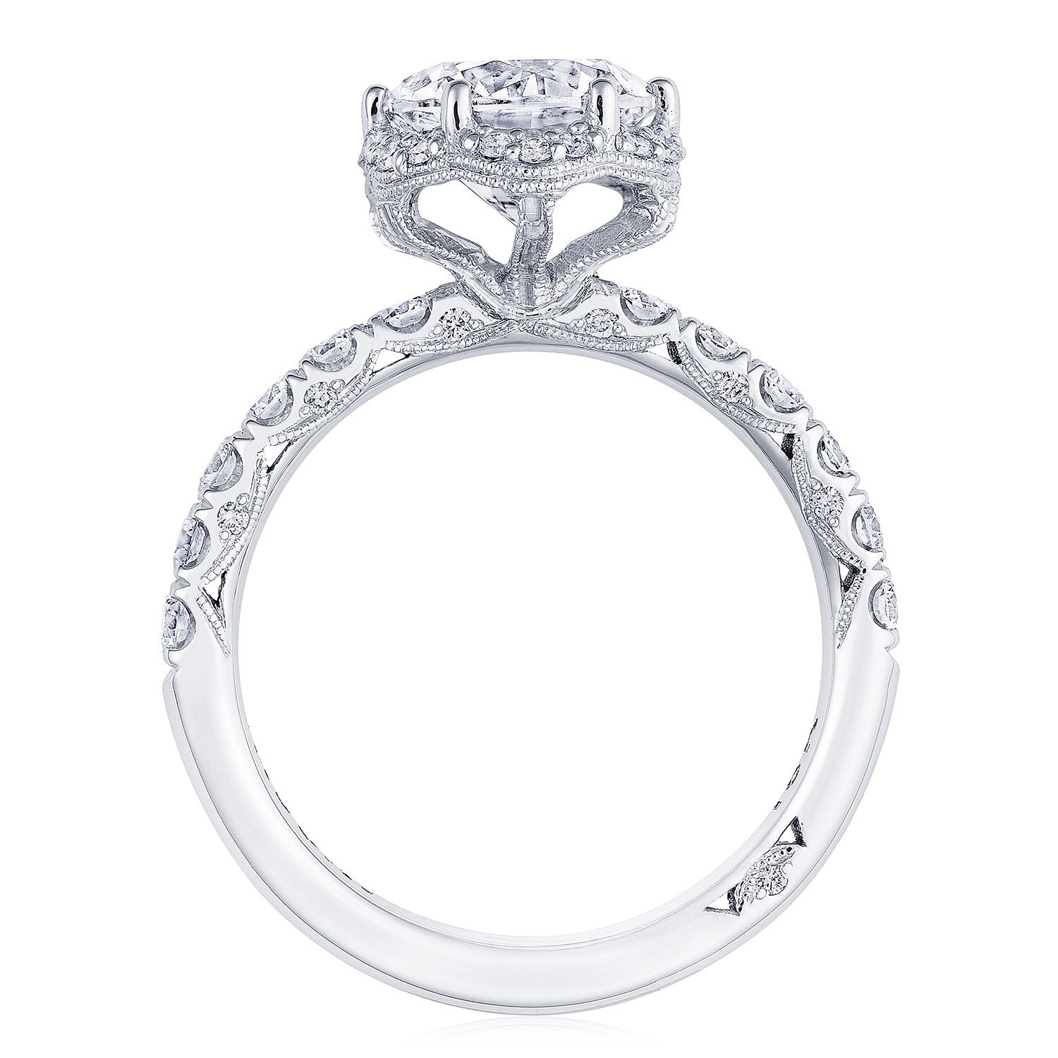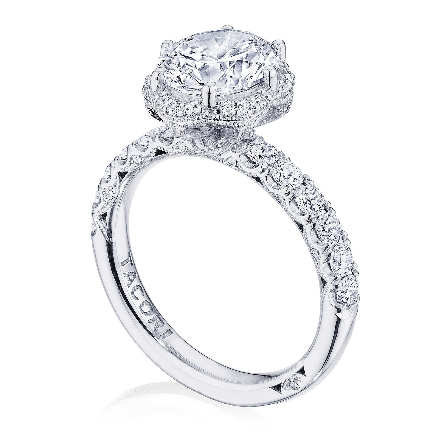 Heralding from the Petite Crescent Collection, this beautiful new style now "blooms" to spotlight your center diamond