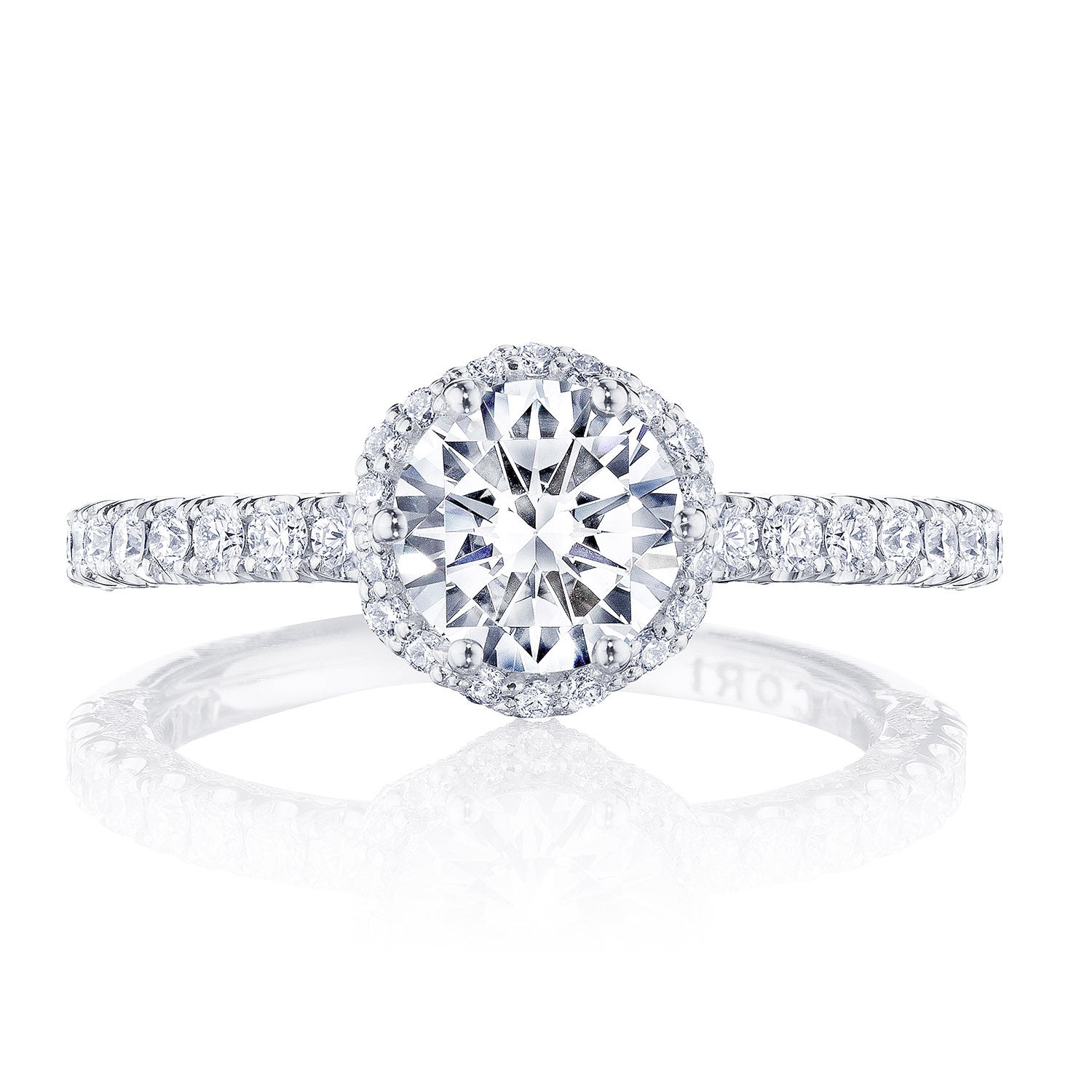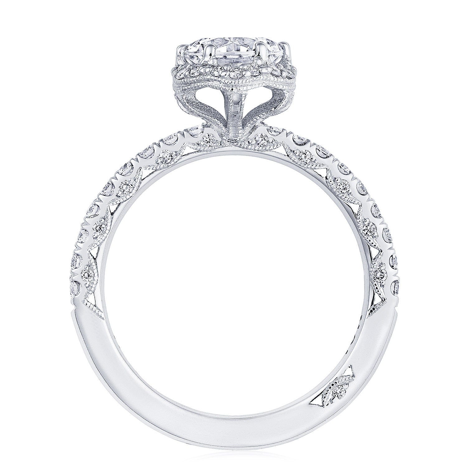Heralding from the Petite Crescent Collection, this beautiful new style now "blooms" to spotlight your center diamond