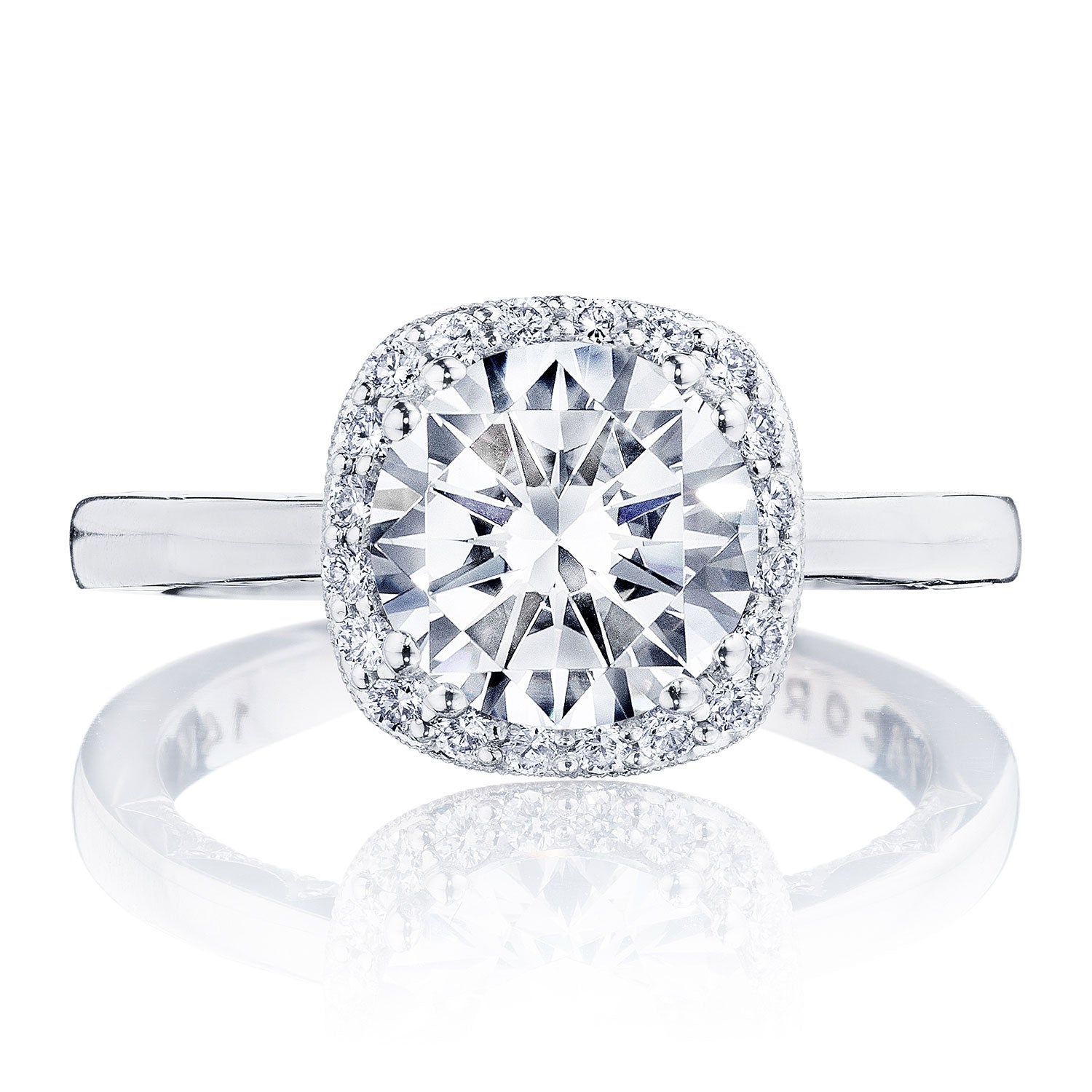 Love in bloom. The beauty in the simplicity of this round brilliant diamond engagement ring with a cushion bloom is amplified by the Coastal Crescent inner face, with a diamond-cuddled detailing underneath the crescent.