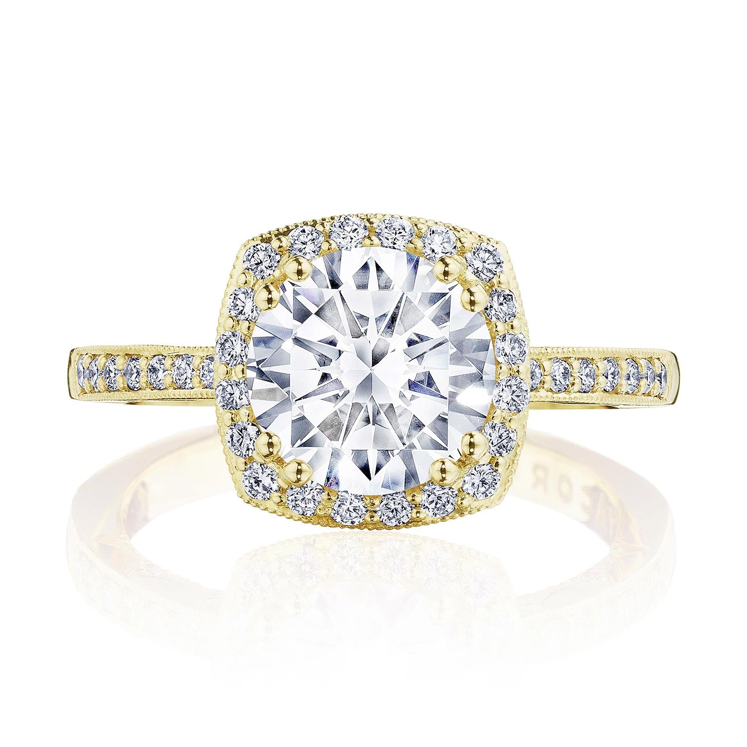 A round cut diamond solitaire is brought to life by a cushion shaped bloom of diamonds and rests gently on an eternity diamond band. This ring features the Coastal Crescent inner face with pinpoint diamond details for a truly regal look.