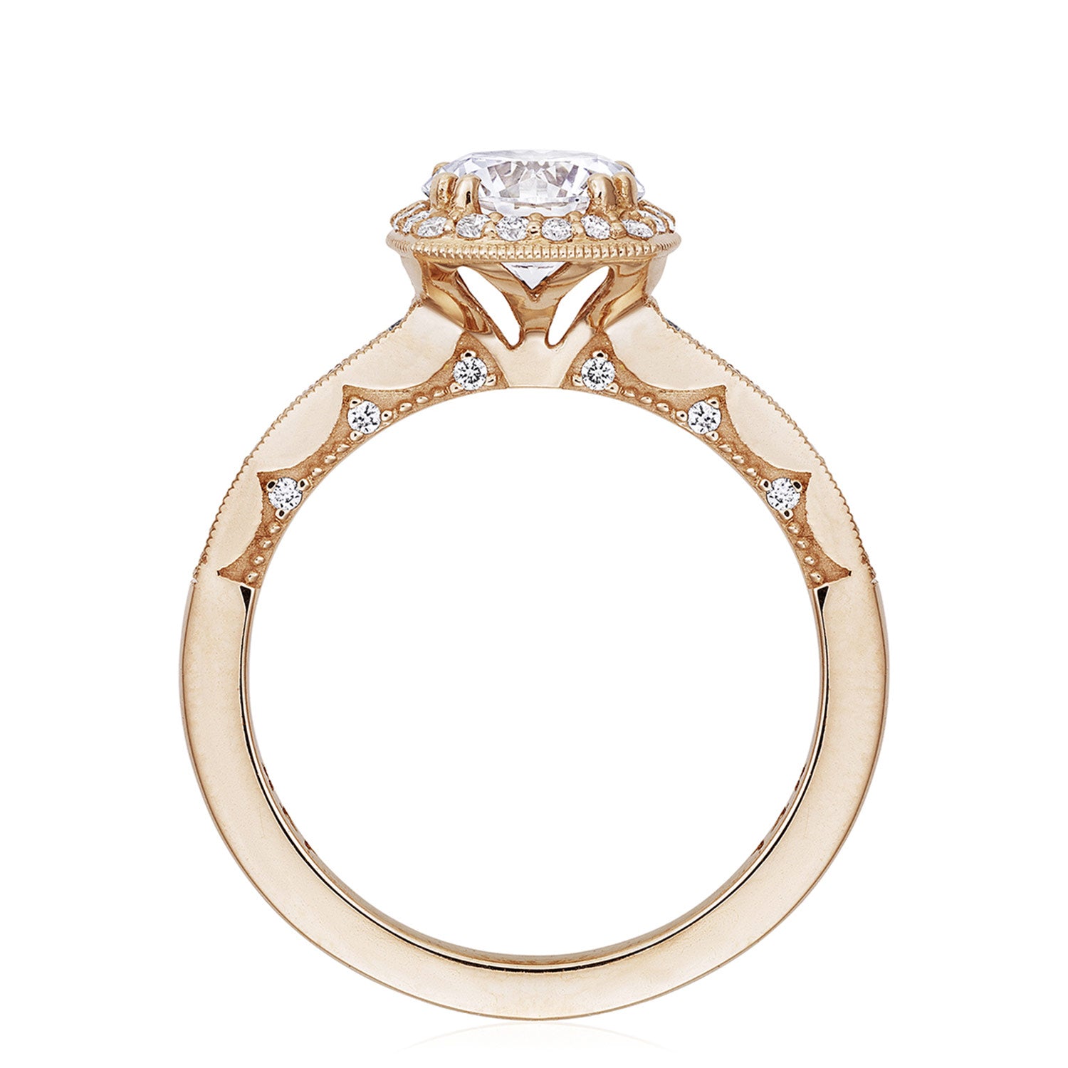 A round brilliant diamond solitaire is brought to life by a cushion shaped bloom of diamonds. This ring features the Coastal Crescent inner face with pinpoint diamond details for a truly regal look.