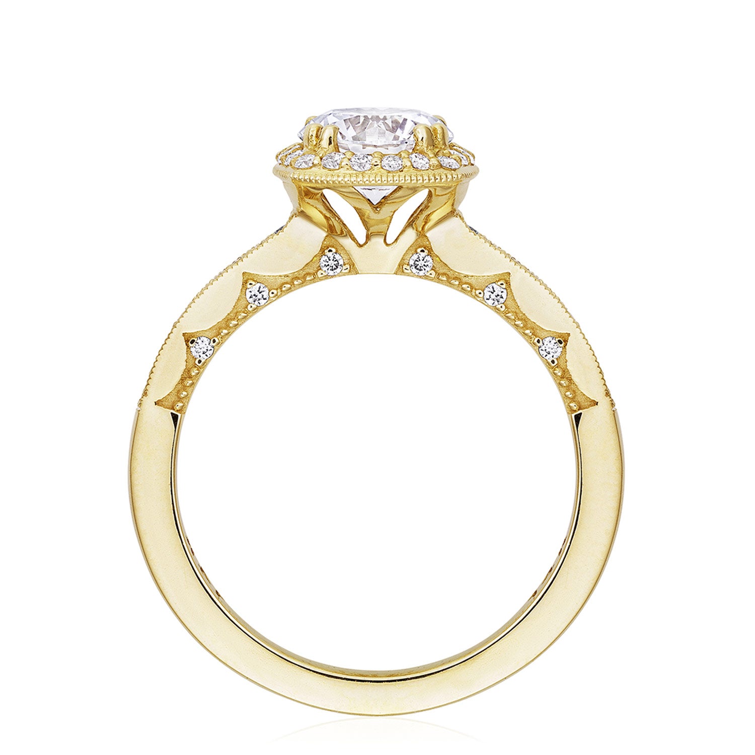 A round brilliant diamond solitaire is brought to life by a cushion shaped bloom of diamonds. This ring features the Coastal Crescent inner face with pinpoint diamond details for a truly regal look.