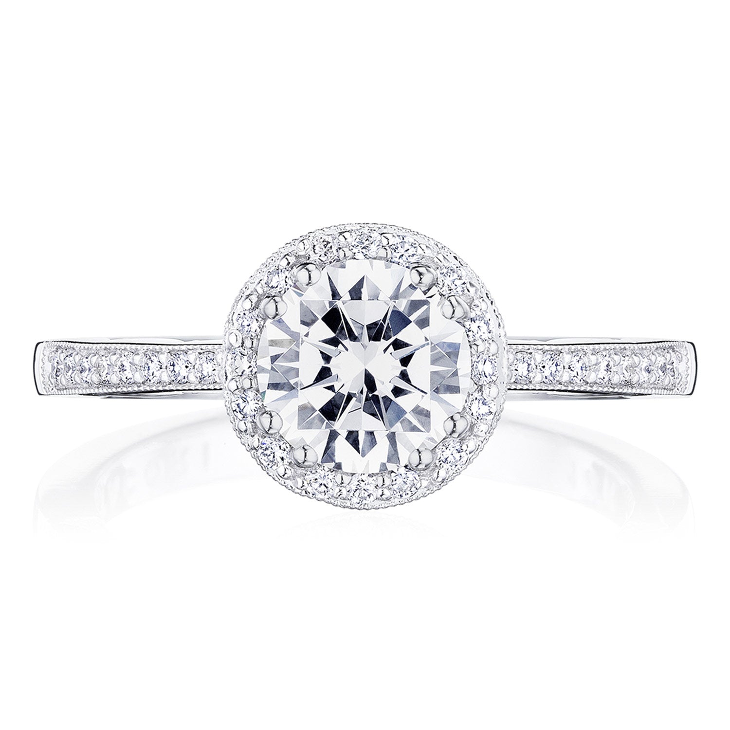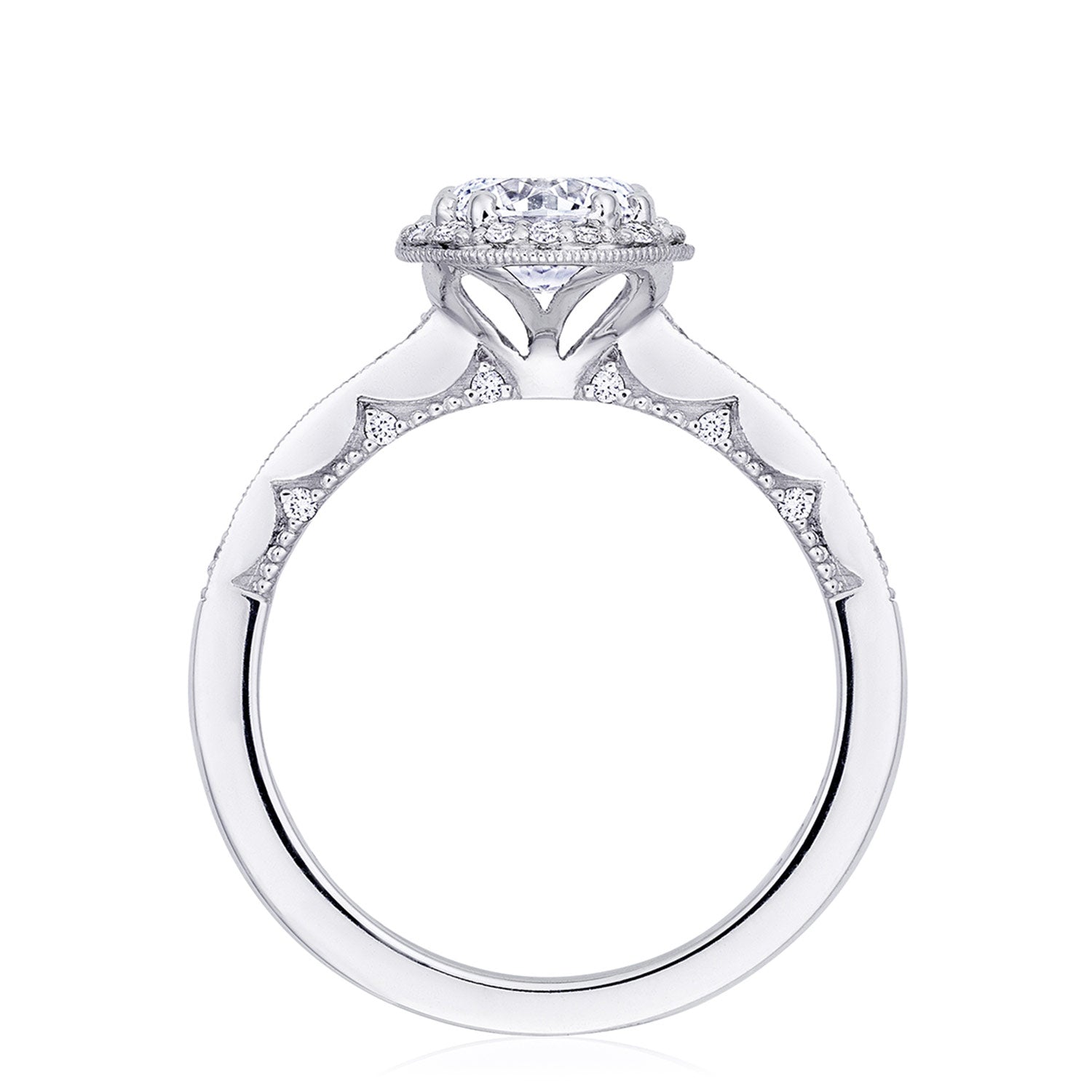 A round cut diamond solitaire is brought to life by a crown of diamonds and rests gently on a diamond band. This ring features the Coastal Crescent inner face with pinpoint diamond details for a truly regal look.