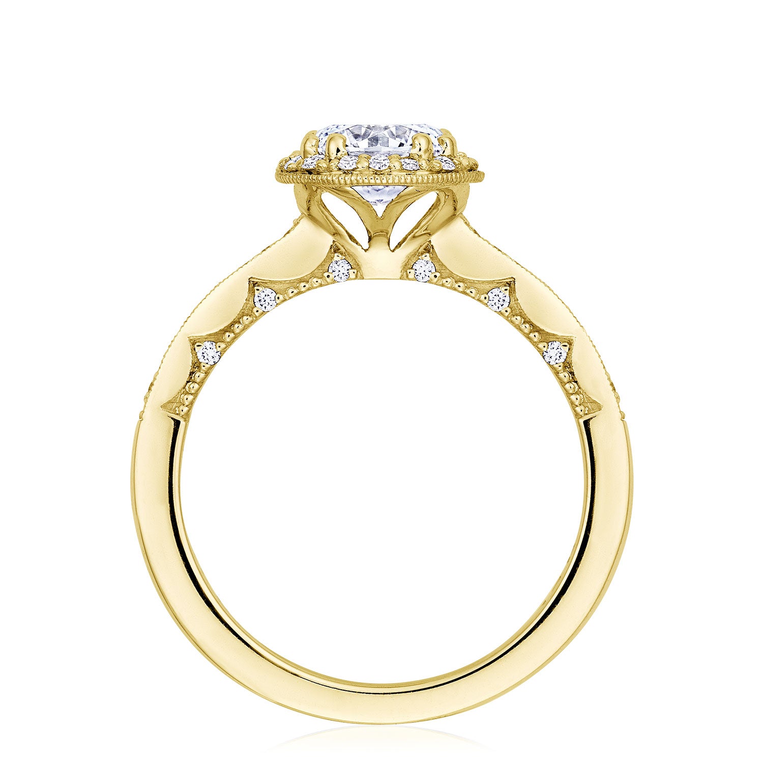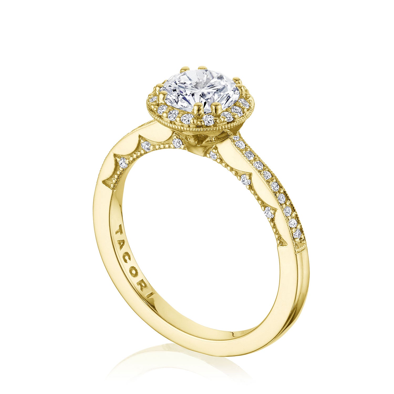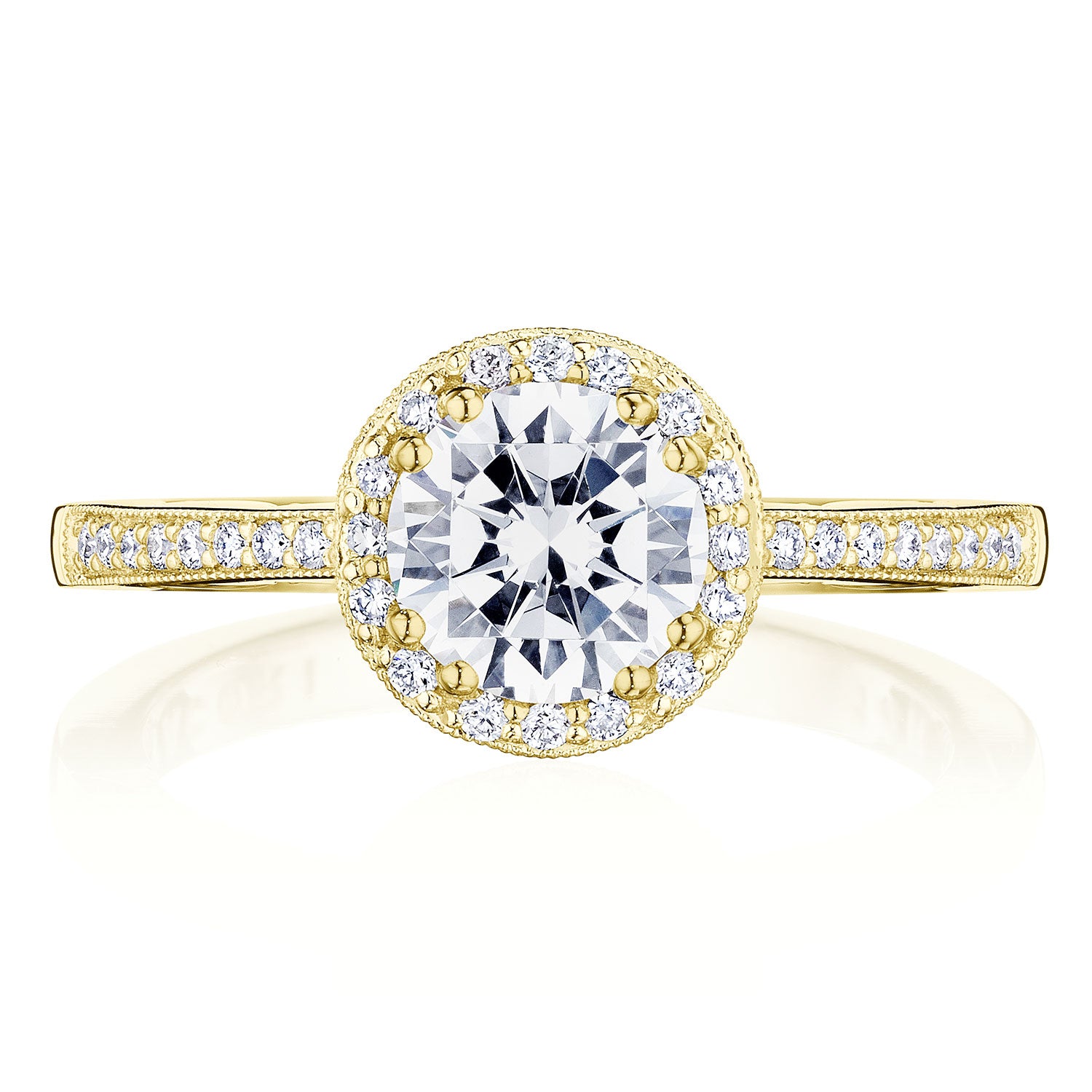 A round cut diamond solitaire is brought to life by a crown of diamonds and rests gently on a diamond band. This ring features the Coastal Crescent inner face with pinpoint diamond details for a truly regal look.
