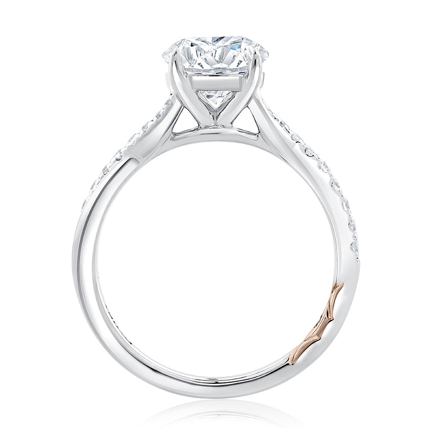 From the A.JAFFE Classics™ Collection, this split shank round cut diamond engagement ring features a crossover design between a plain metal band and a true pavé diamond band. The classic interior features a petite version of the A.JAFFE Quilts™. All A.JAFFE bridal rings are expertly handcrafted with beauty, luxury and comfort in mind.
