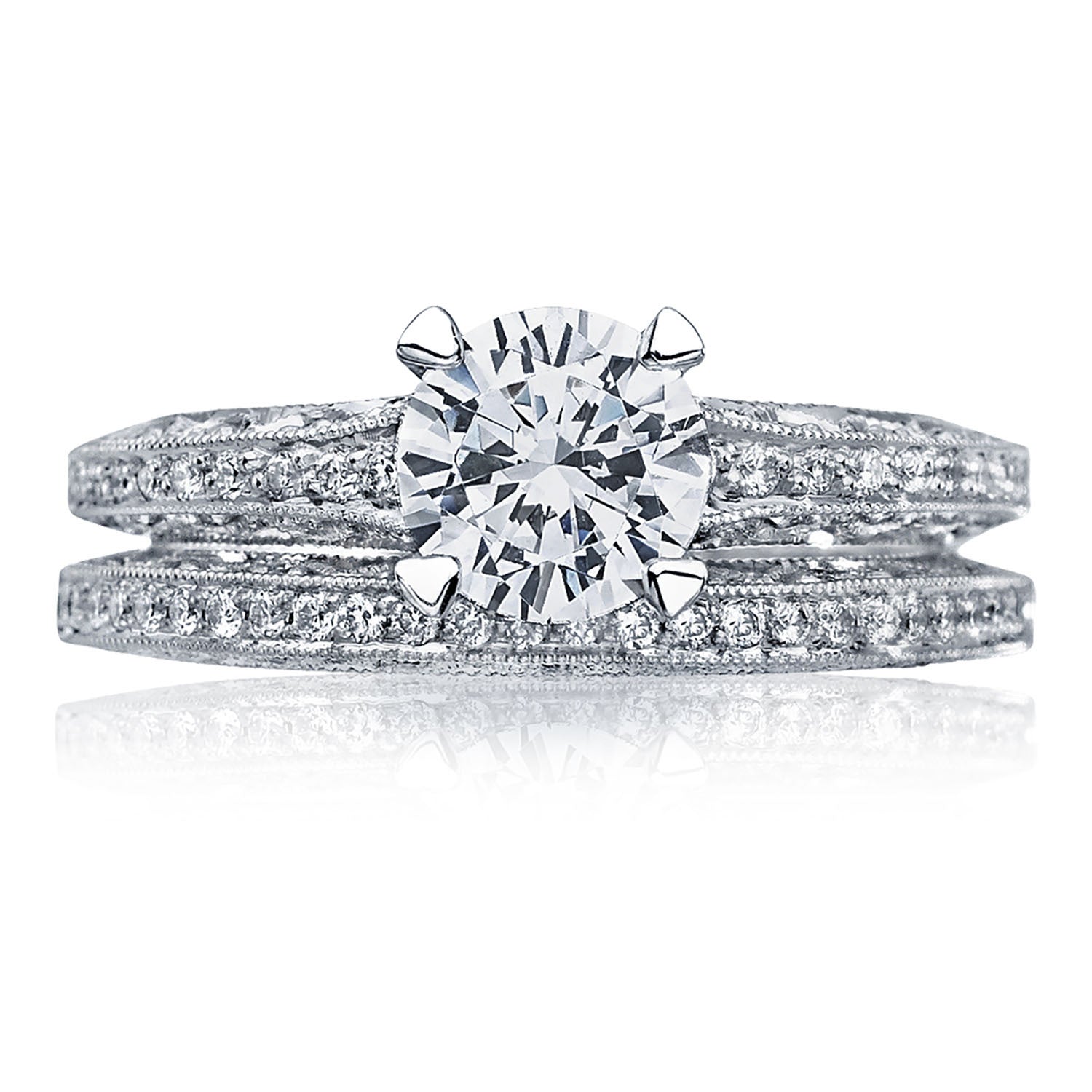 A diamond-studded Classic Crescent inner face with round brilliant diamonds across the ceiling. One signature crescent sits at the resting point, while a Cathedral Foundation adds diamond detailing beneath the crown.