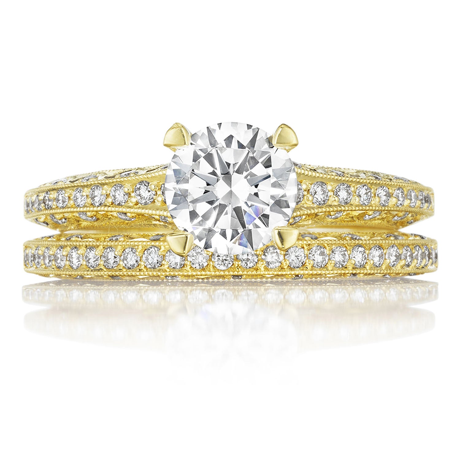 A diamond-studded Classic Crescent inner face with round brilliant diamonds across the ceiling. One signature crescent sits at the resting point, while a Cathedral Foundation adds diamond detailing beneath the crown.