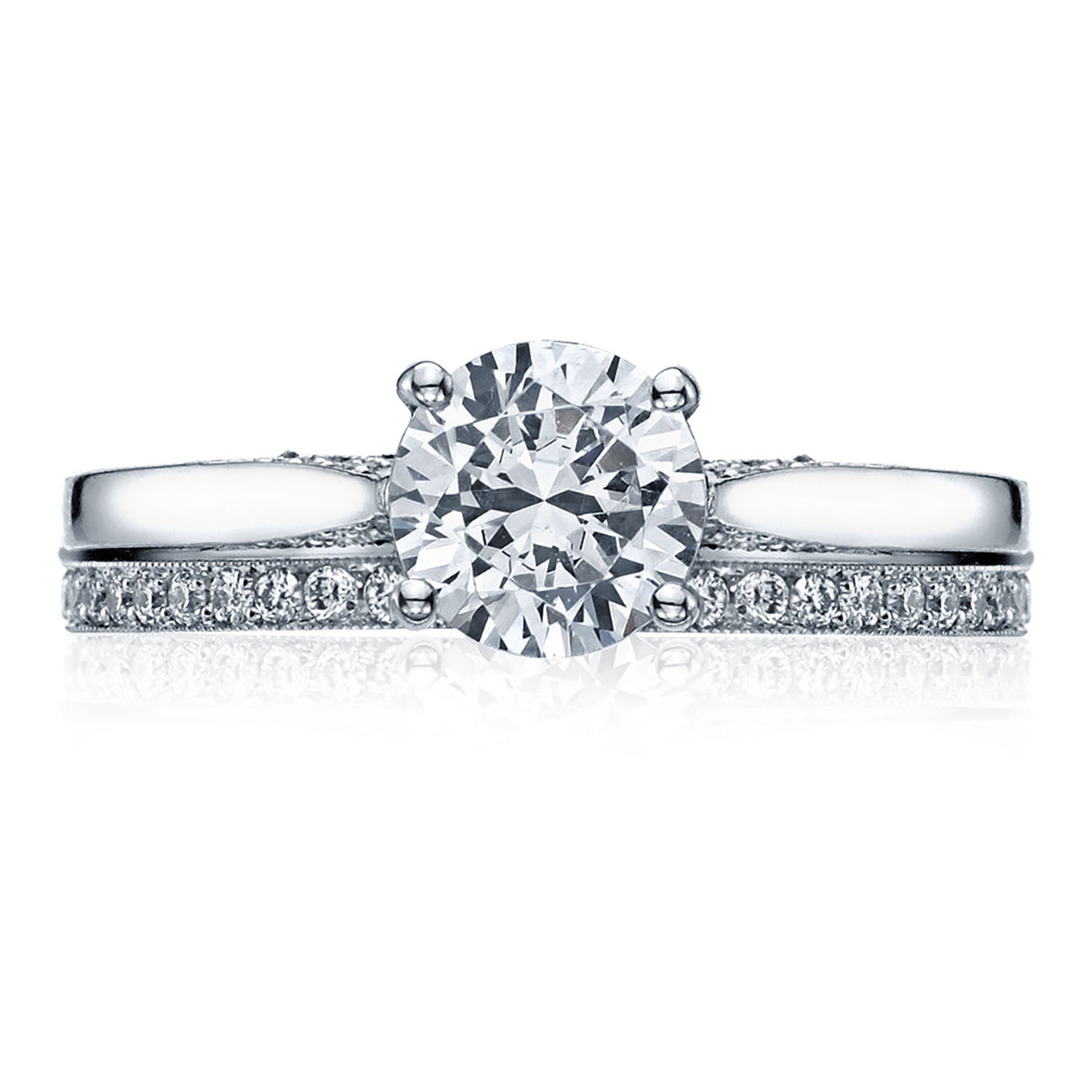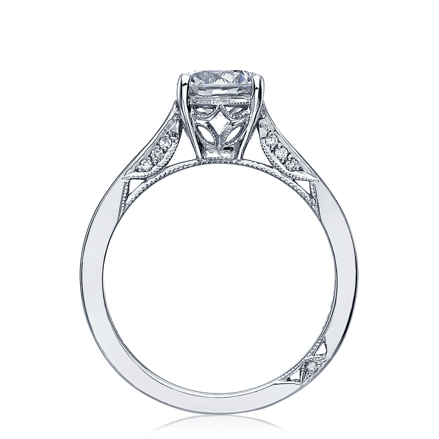 Large crescent motifs give a sweet romance to a solitaire ring, with beautiful diamond accents for special surprise detail from every angle.