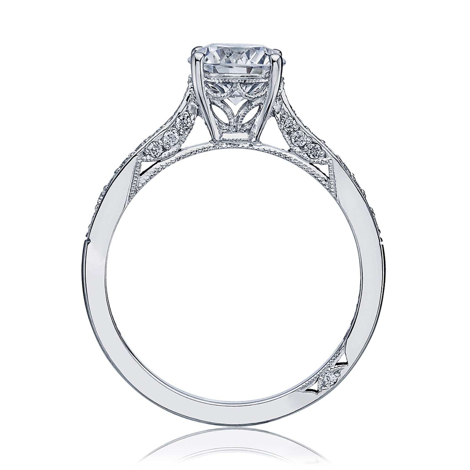 Large crescent motifs give a sweet romance to a solitaire ring, with beautiful diamond accents for special surprise detail from every angle.