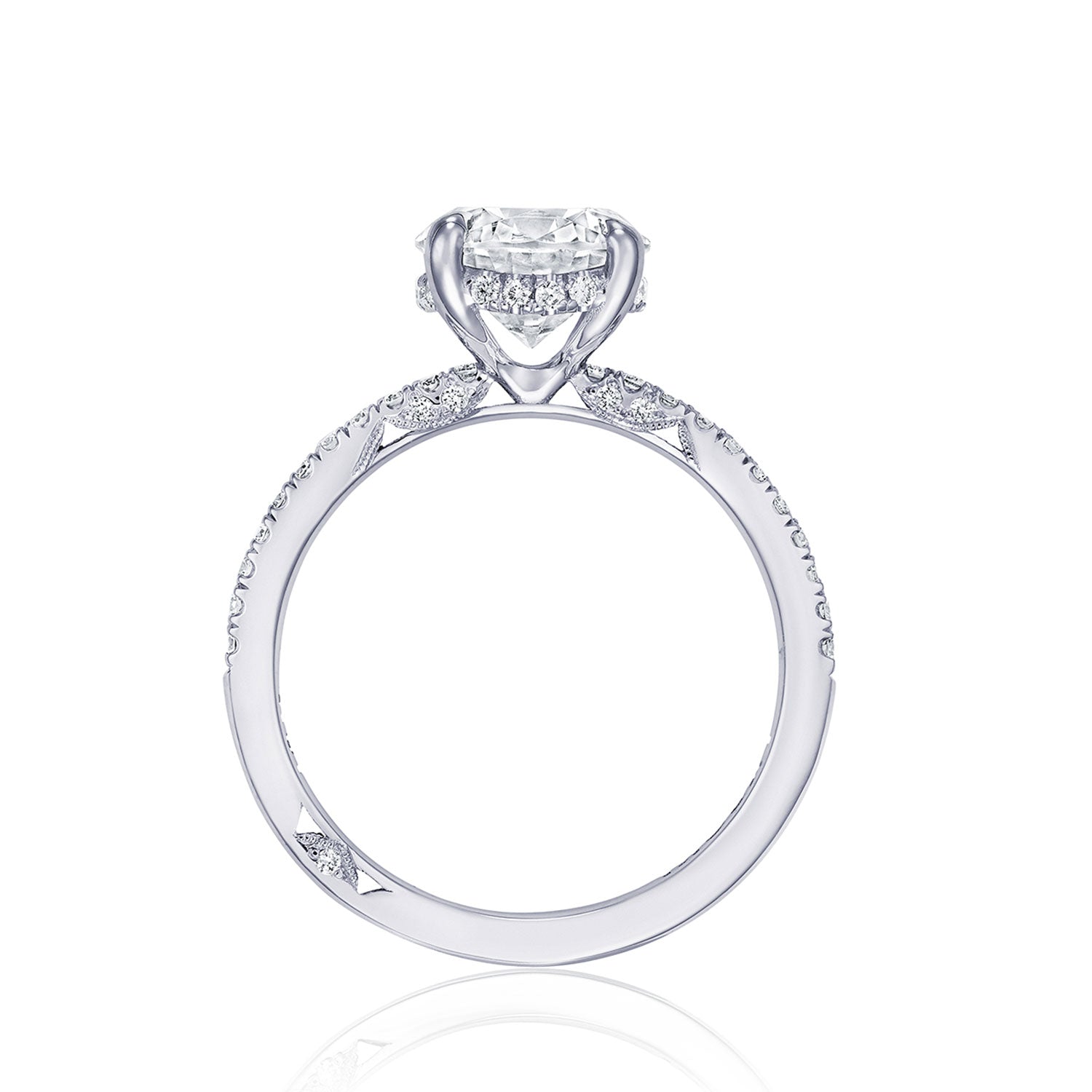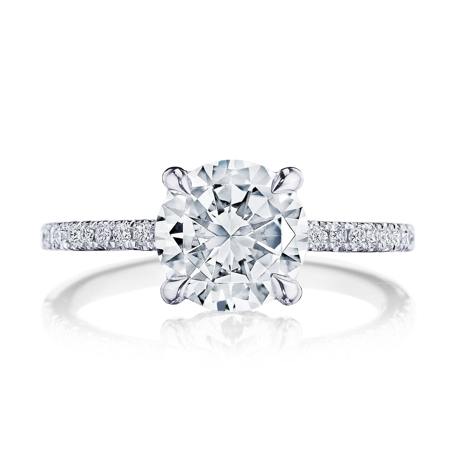 A bold solitaire diamond look with a thin band - this exceptional beauty will make you say I Do. Look for the secret detail diamond-inscribed T detail on the setting of the ring.