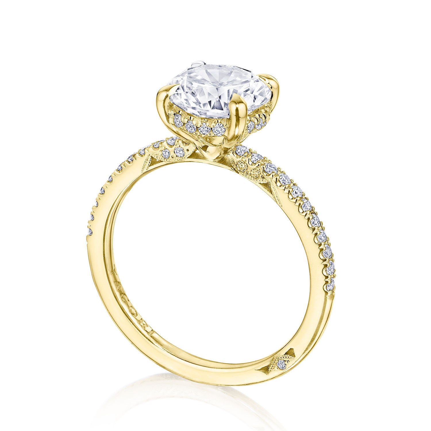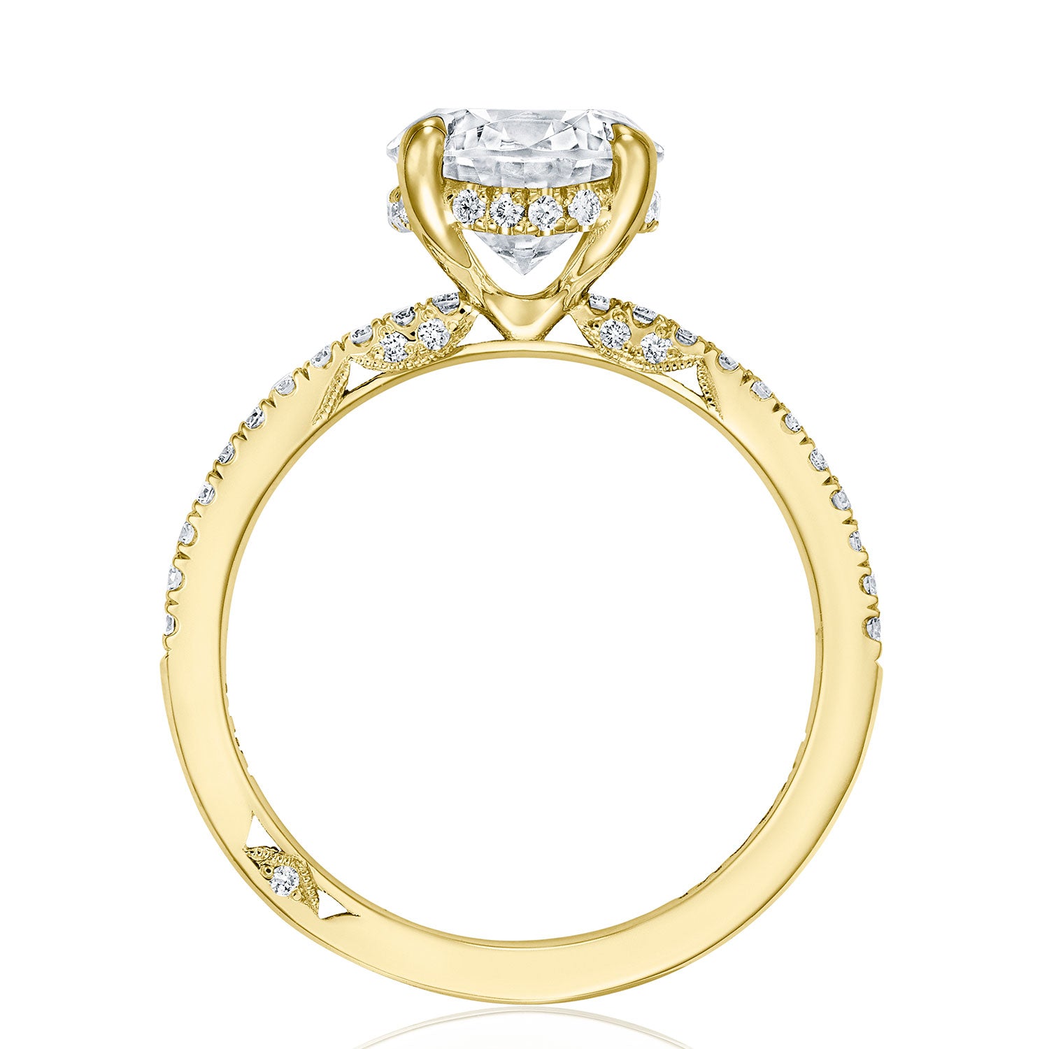 A bold solitaire diamond look with a thin band - this exceptional beauty will make you say I Do. Look for the secret detail diamond-inscribed T detail on the setting of the ring.