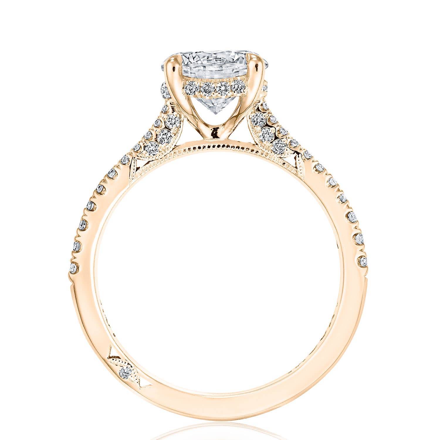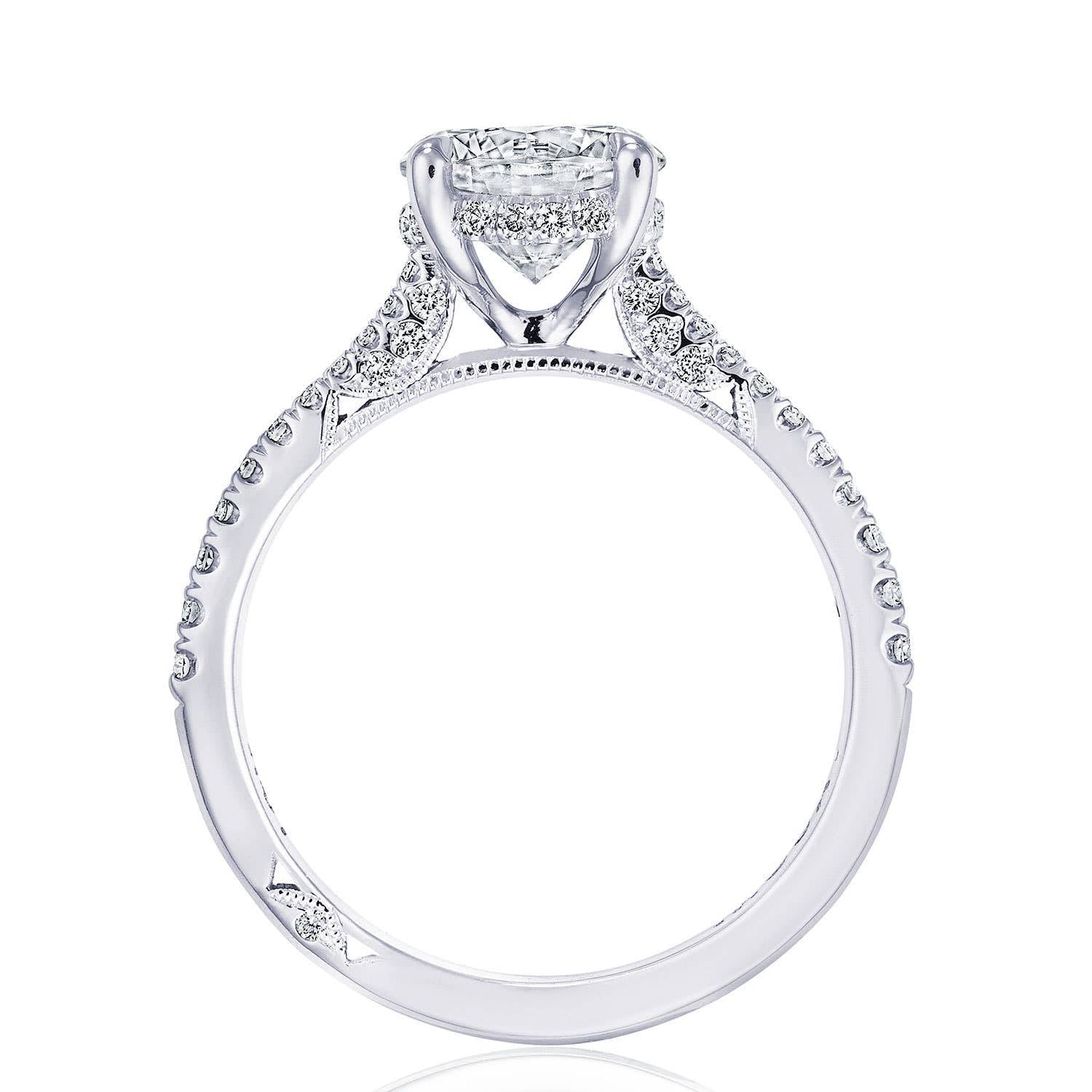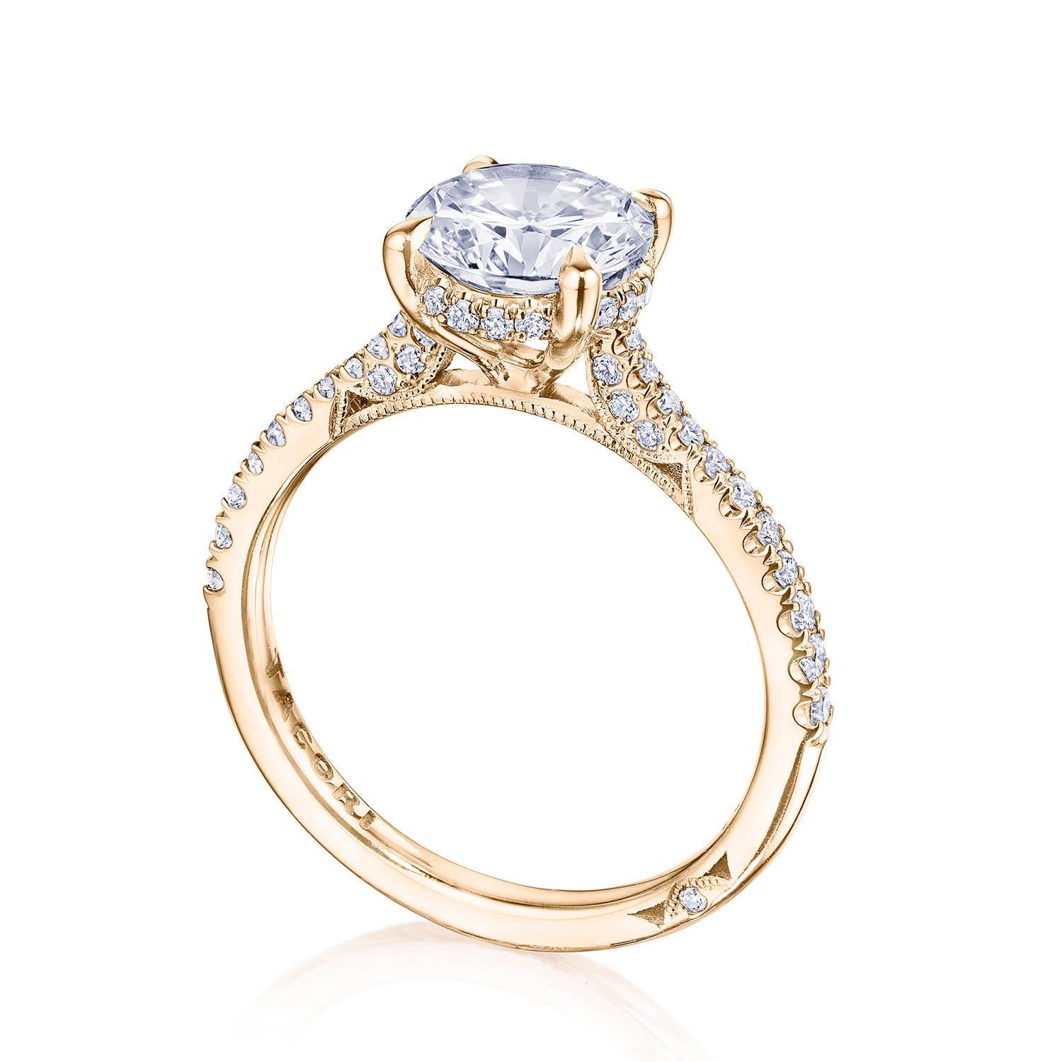 Strong solitaire look with a thin band that delivers brilliant detail- this Truly T varietal of Simply Tacori features a Cathedral foundation with French pavé set diamonds on the band and is perfect for the modern bride. Look for the secret diamond inscribed, "T" detail on the setting of the ring.