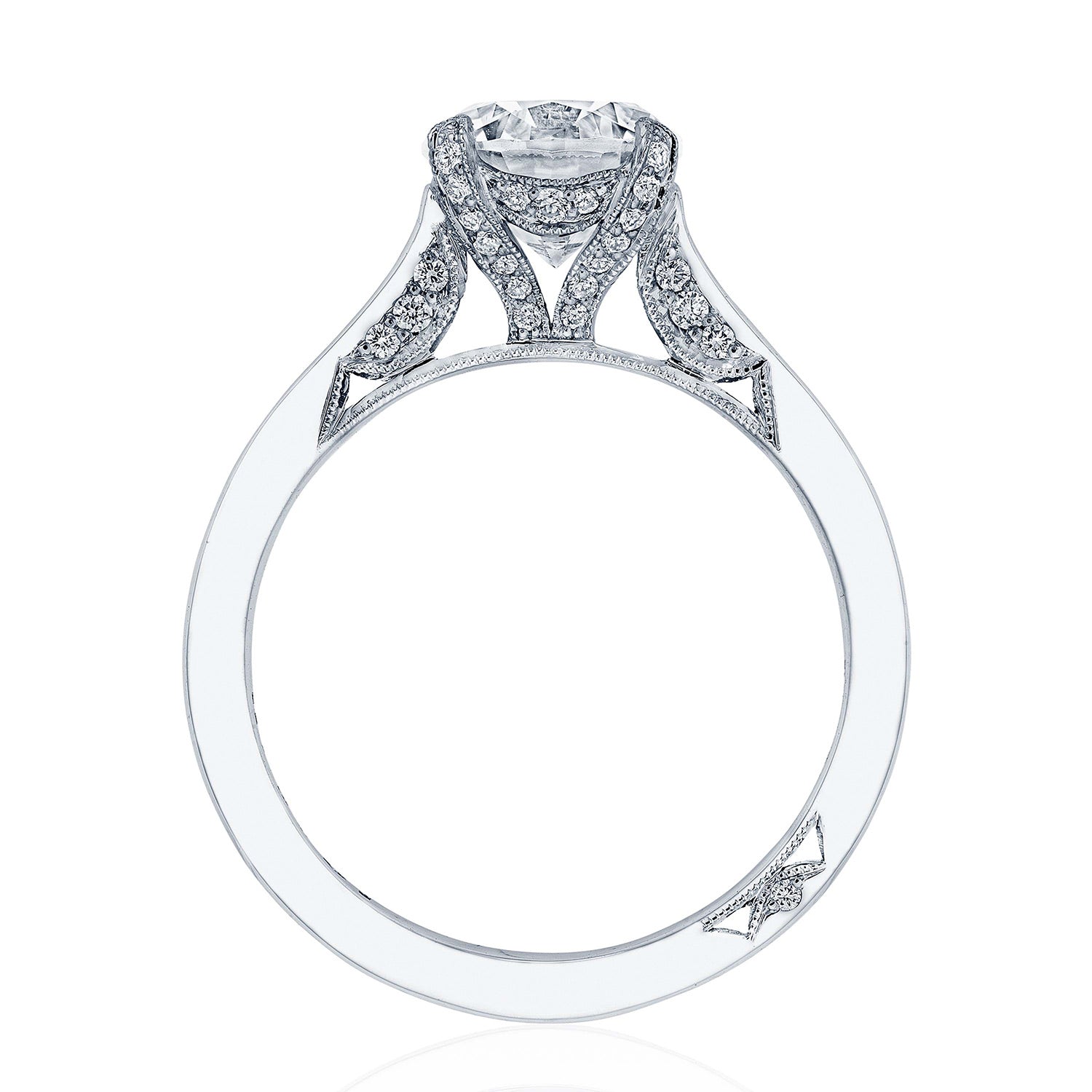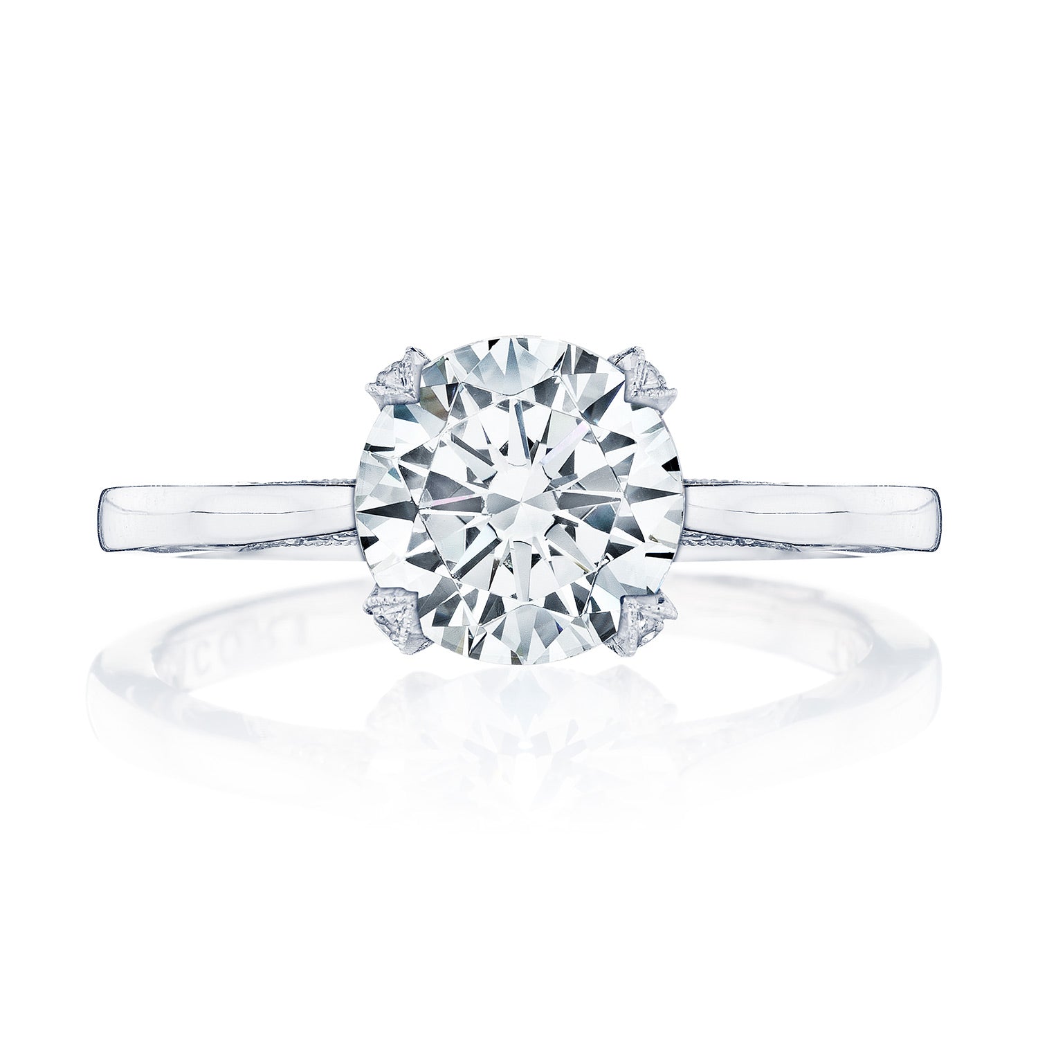 Delicate details and a dainty Cathedral foundation. This Simply Tacori solitaire features an effortlessly modern, hi-polish ceiling and round brilliant cut center.