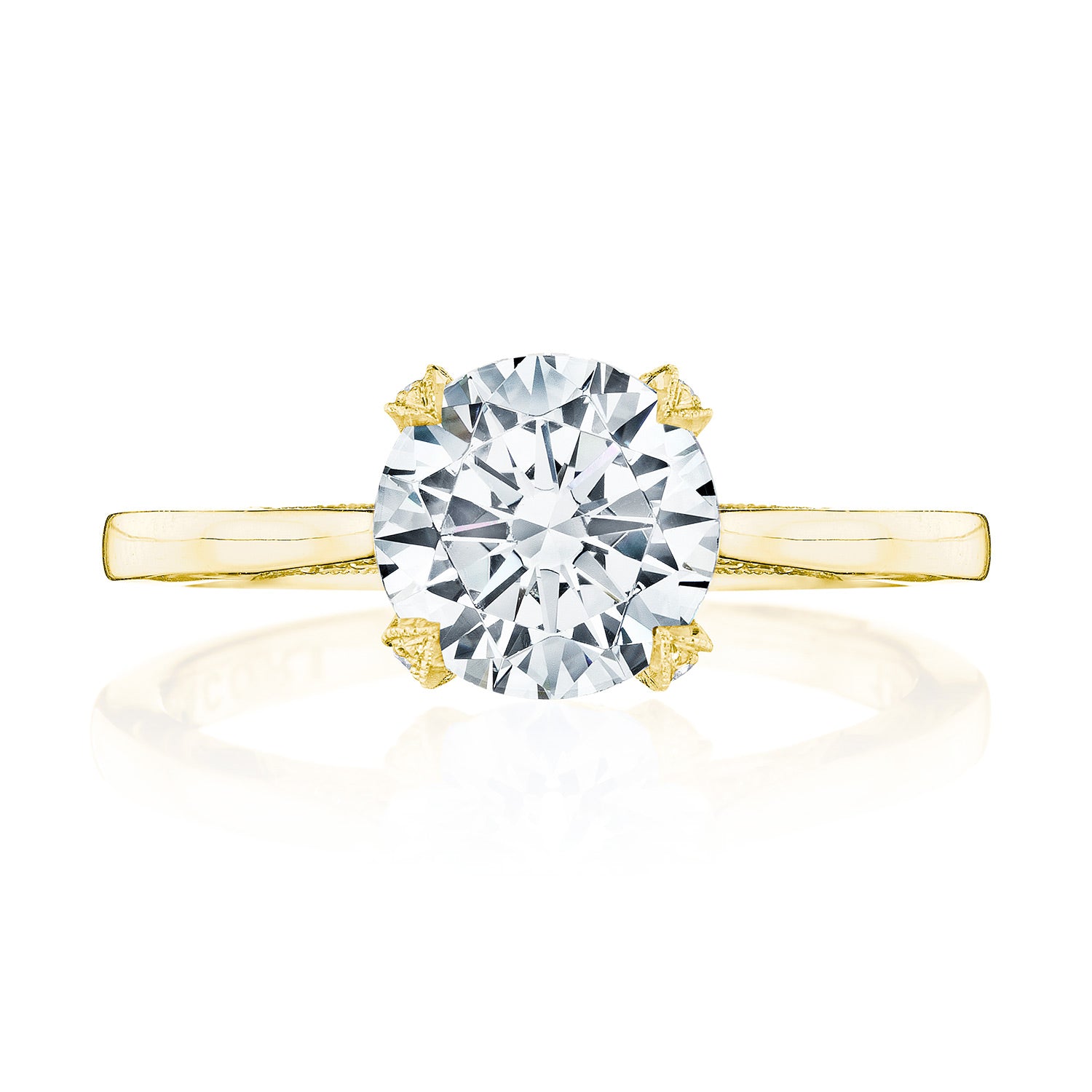 Delicate details and a dainty Cathedral foundation. This Simply Tacori solitaire features an effortlessly modern, hi-polish ceiling and round brilliant cut center.