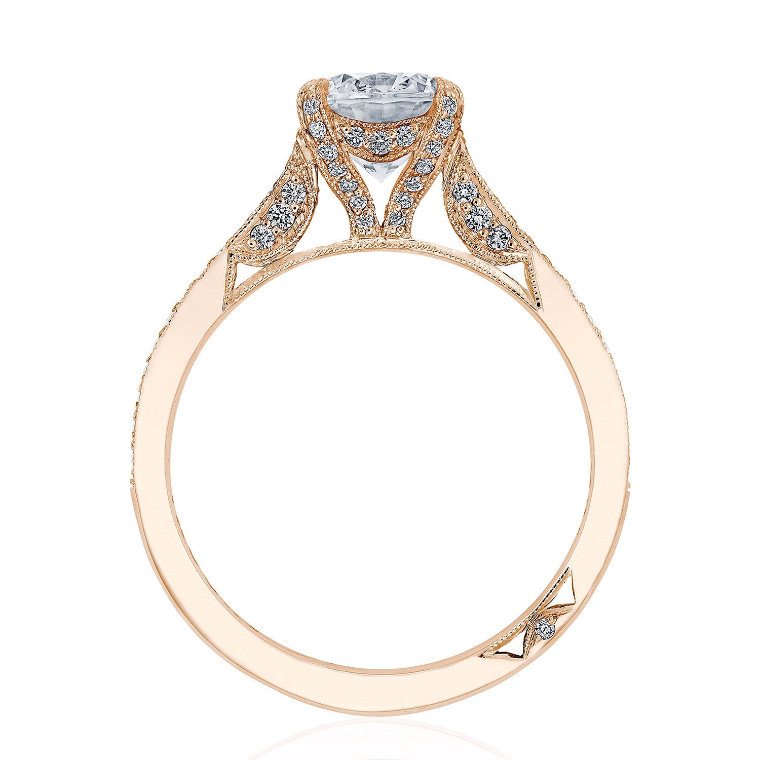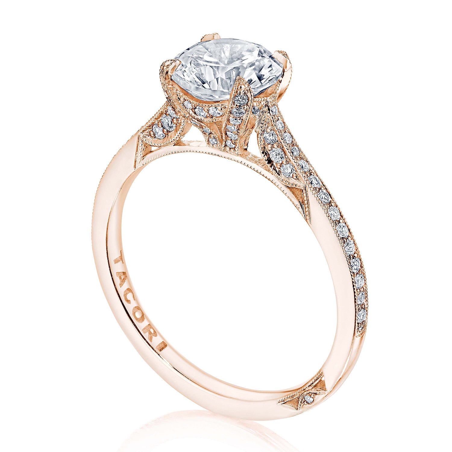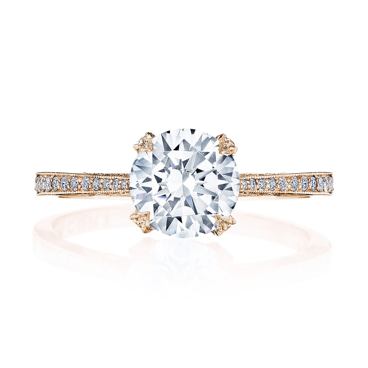 Delicate details and a dainty Cathedral foundation. This Simply Tacori solitaire features a high shine pavé diamond ceiling and round brilliant cut center.