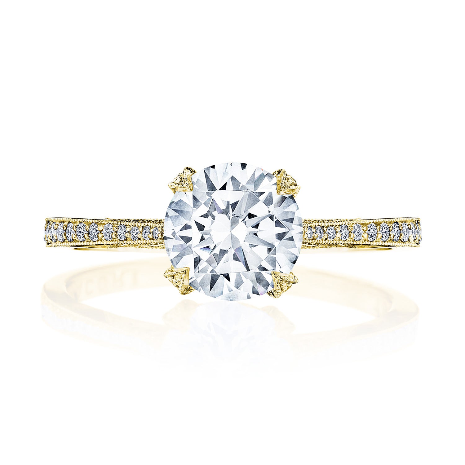 Delicate details and a dainty Cathedral foundation. This Simply Tacori solitaire features a high shine pavé diamond ceiling and round brilliant cut center.