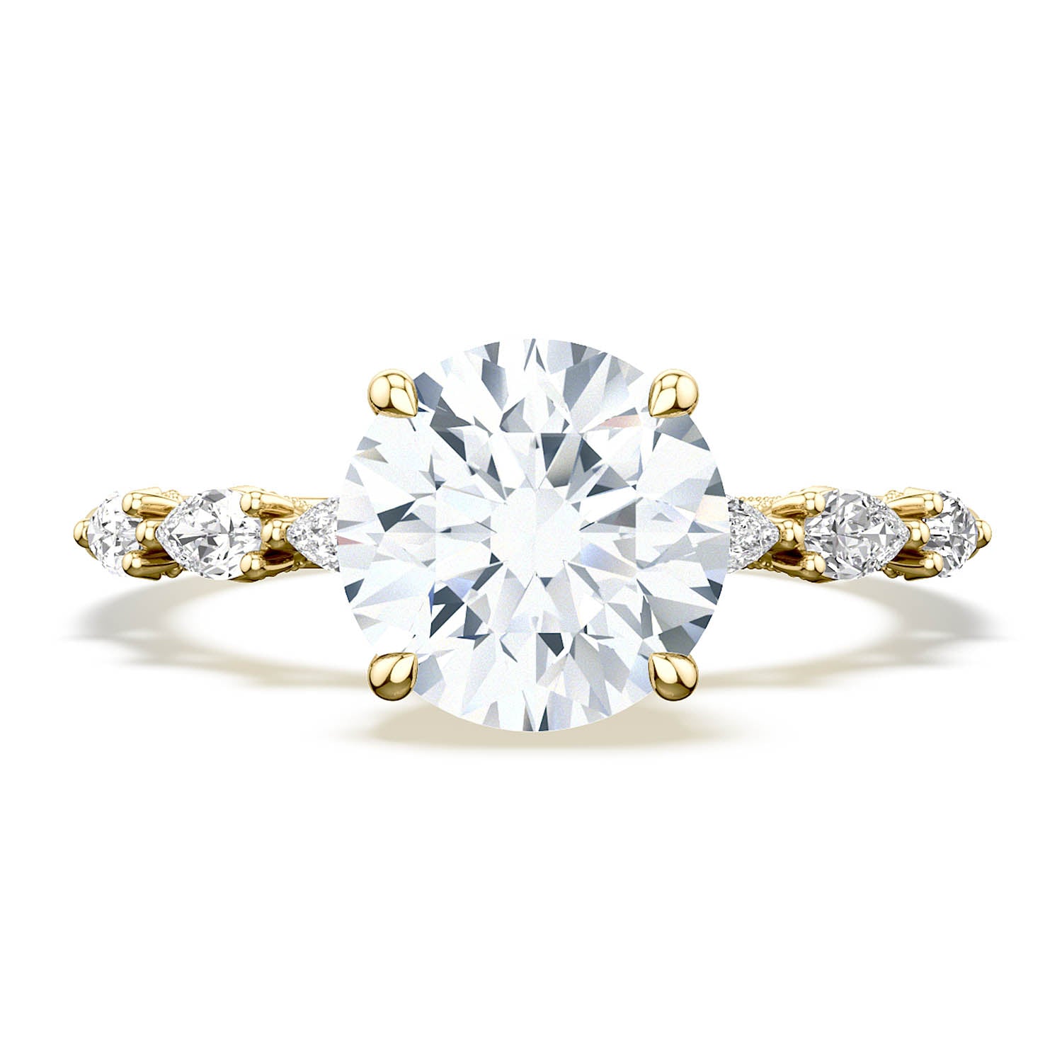 This intricately detailed engagement ring puts a spotlight on pear-shaped diamonds. Diamond accents and beading enhance an elegant crown with hidden bloom detail and a Sculpted Crescent inner face with crescent signature at the resting point.