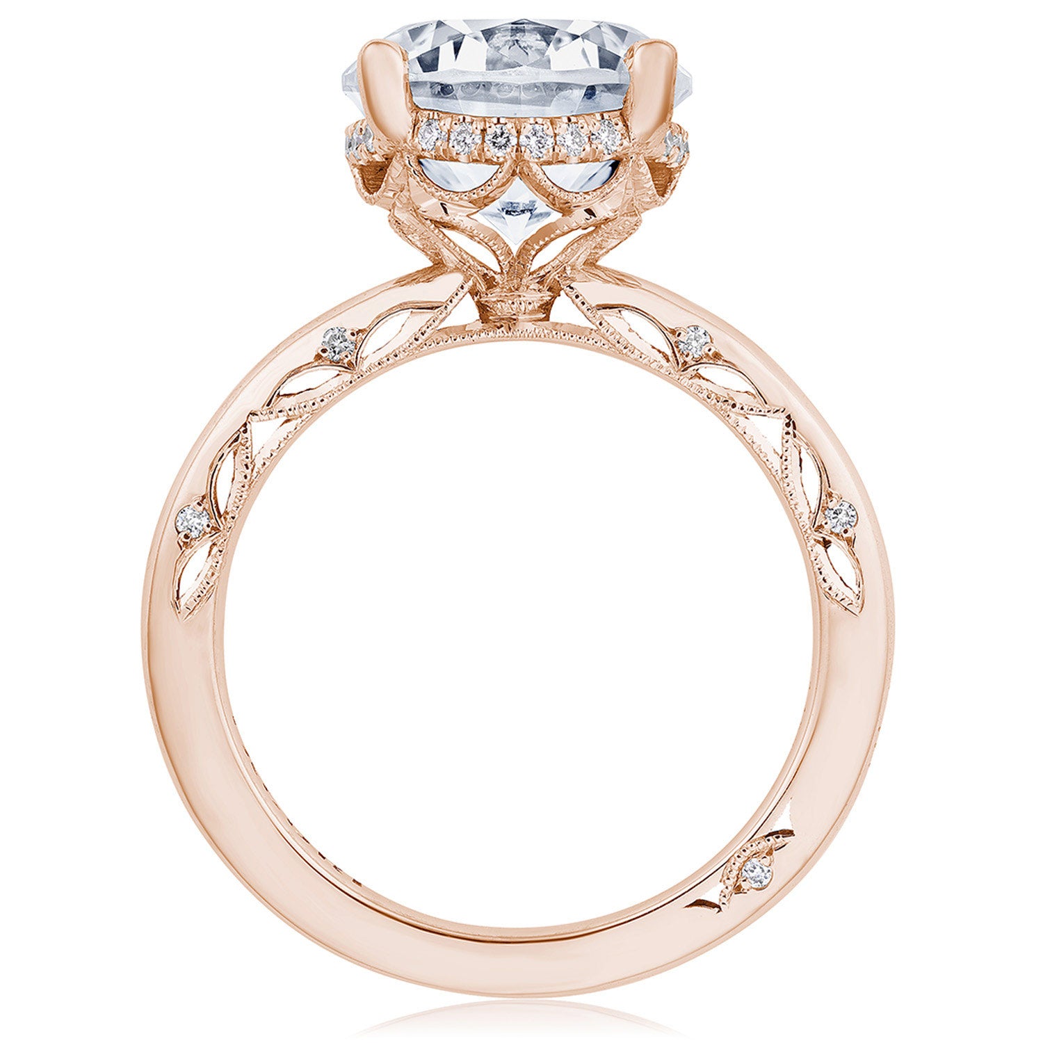 A high-polish ceiling accented with lace-like tracery makes for a stunningly airy setting. The hand-hewn milgrain and pinpoint diamonds add nuance, while a hidden bloom creates dimensional light. A Signature Crescent marks the resting point.