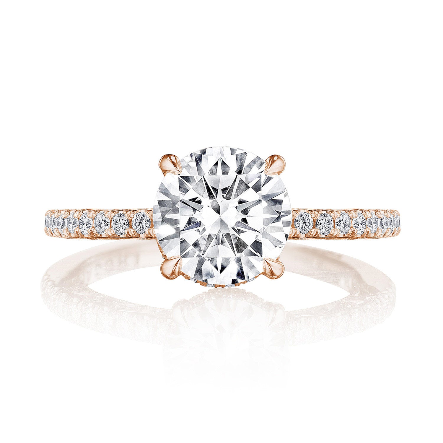 A French pavé ceiling adds dimensional light, while a hidden bloom and open air crown work illuminates the center stone. A complex and alluring lace-like Crescent Fabric gives stunning texture to the inner face profile.