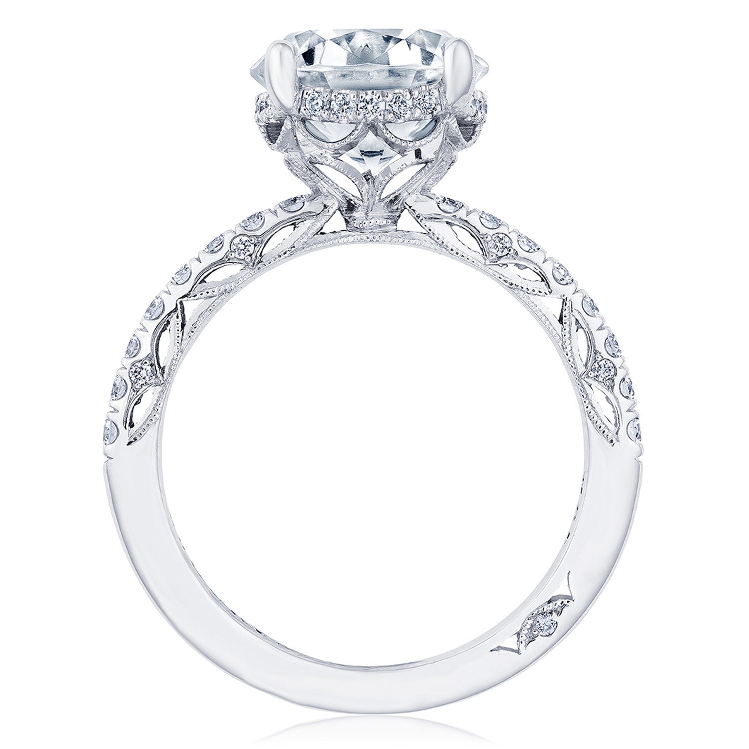 A French pavé ceiling adds dimensional light, while a hidden bloom and open air crown work illuminates the center stone. A complex and alluring lace-like Crescent Fabric gives stunning texture to the inner face profile.