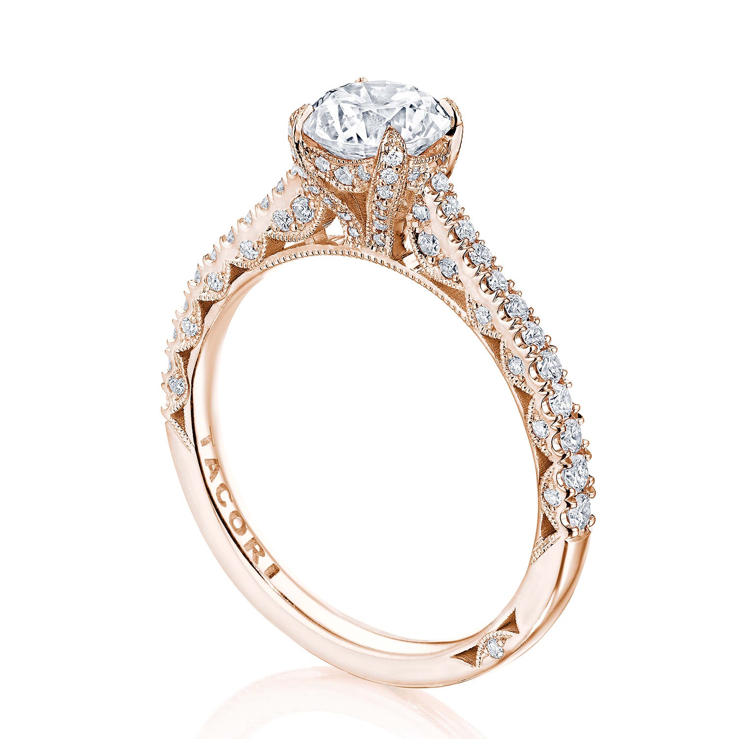 Pave-set diamonds are tapered along the ceiling, leading to a center solitaire set with diamond-studded prongs of a Cathedral foundation. A hidden bloom adds sparkle beneath the crown, and Petite Crescent decorates the innerface.