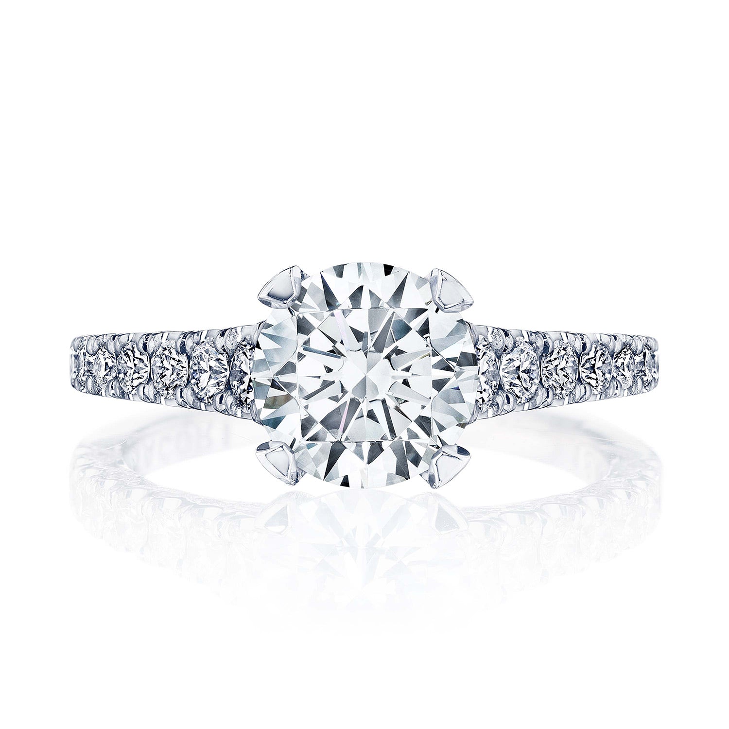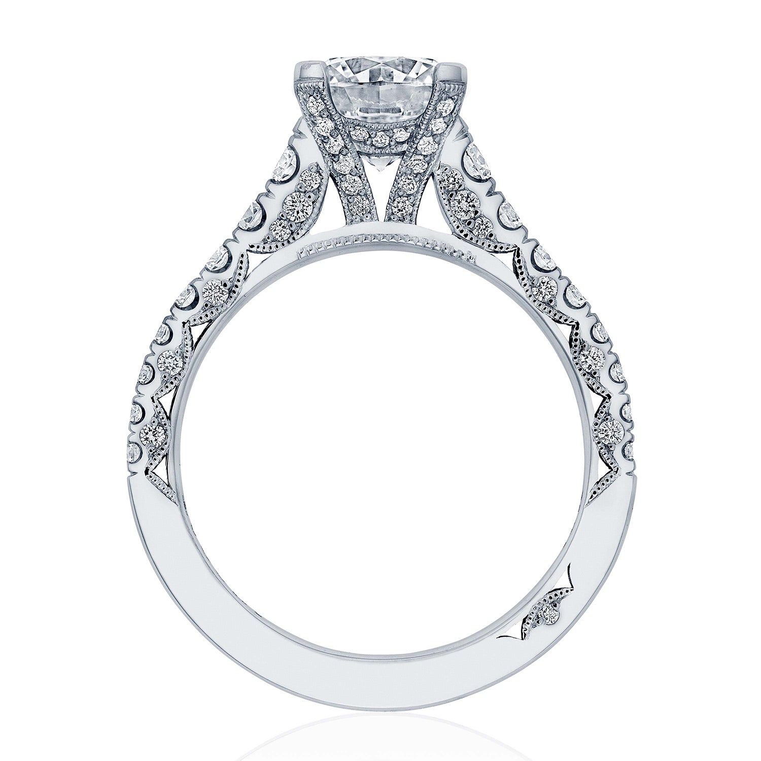Tapering pavé-set diamonds lead up the ceiling towards the center stone, which is set on a diamond-studded Cathedral foundation above a hidden bloom and a band of Petite Crescent fabric. A Signature Crescent marks the foundation of the ring.
