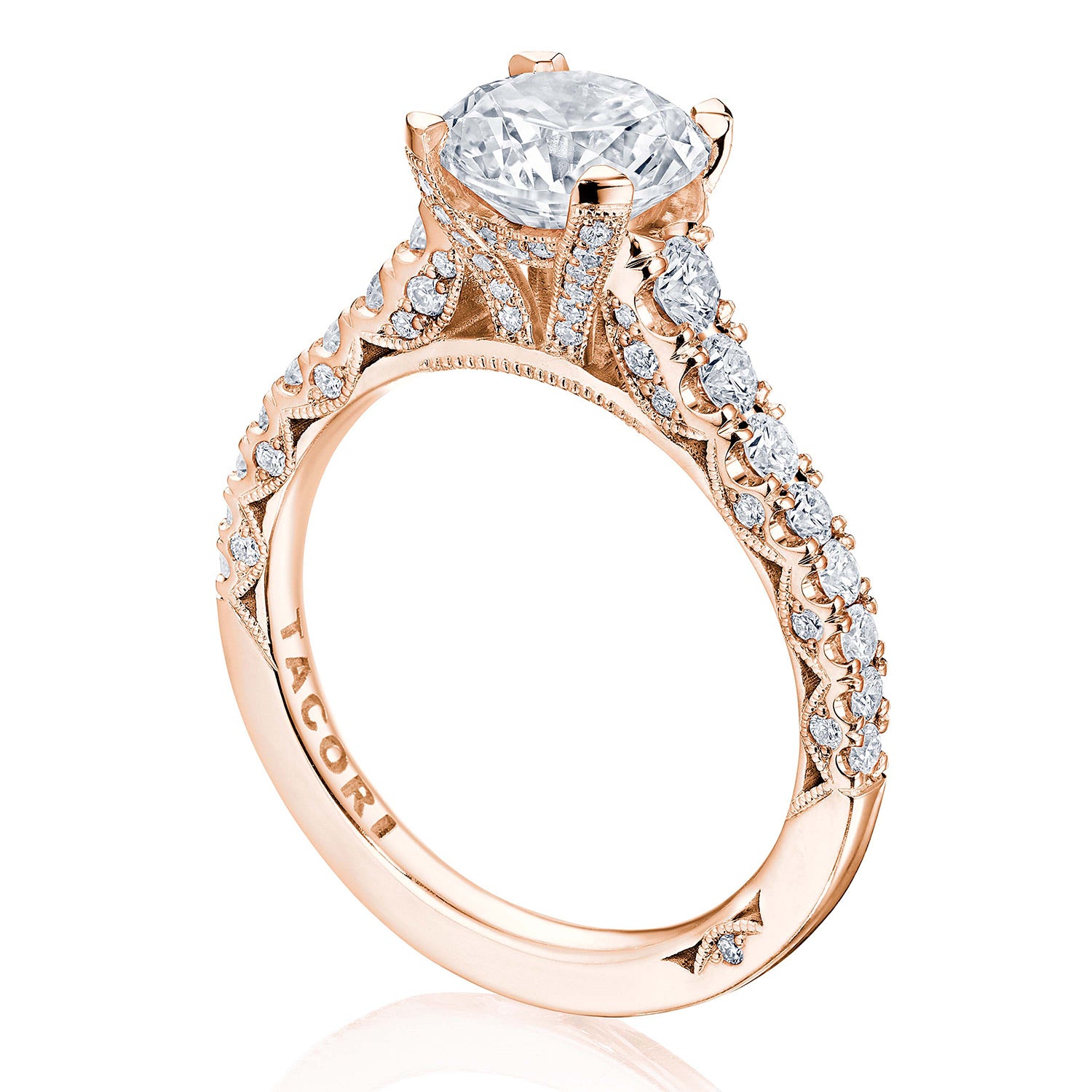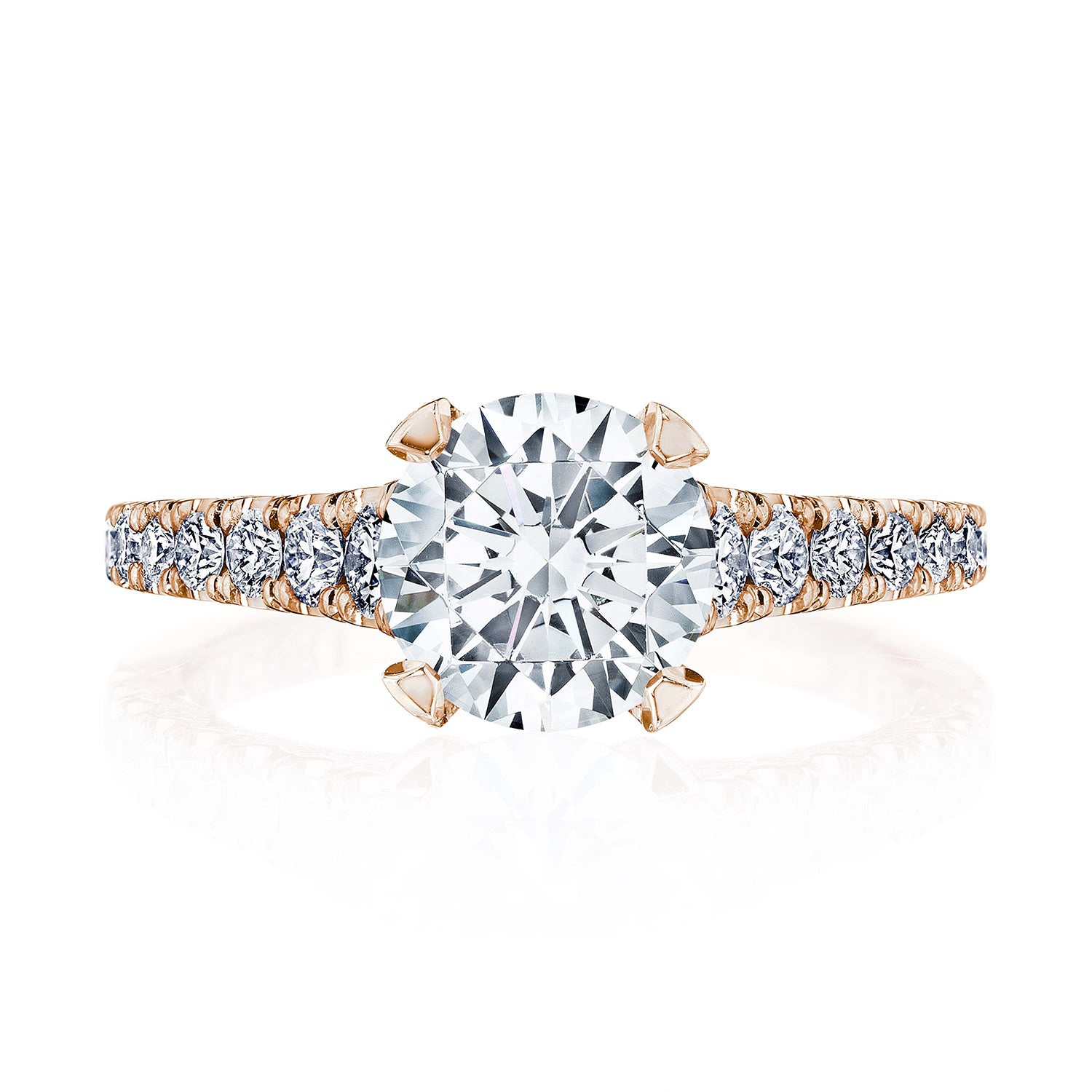 Tapering pavé-set diamonds lead up the ceiling towards the center stone, which is set on a diamond-studded Cathedral foundation above a hidden bloom and a band of Petite Crescent fabric. A Signature Crescent marks the foundation of the ring.
