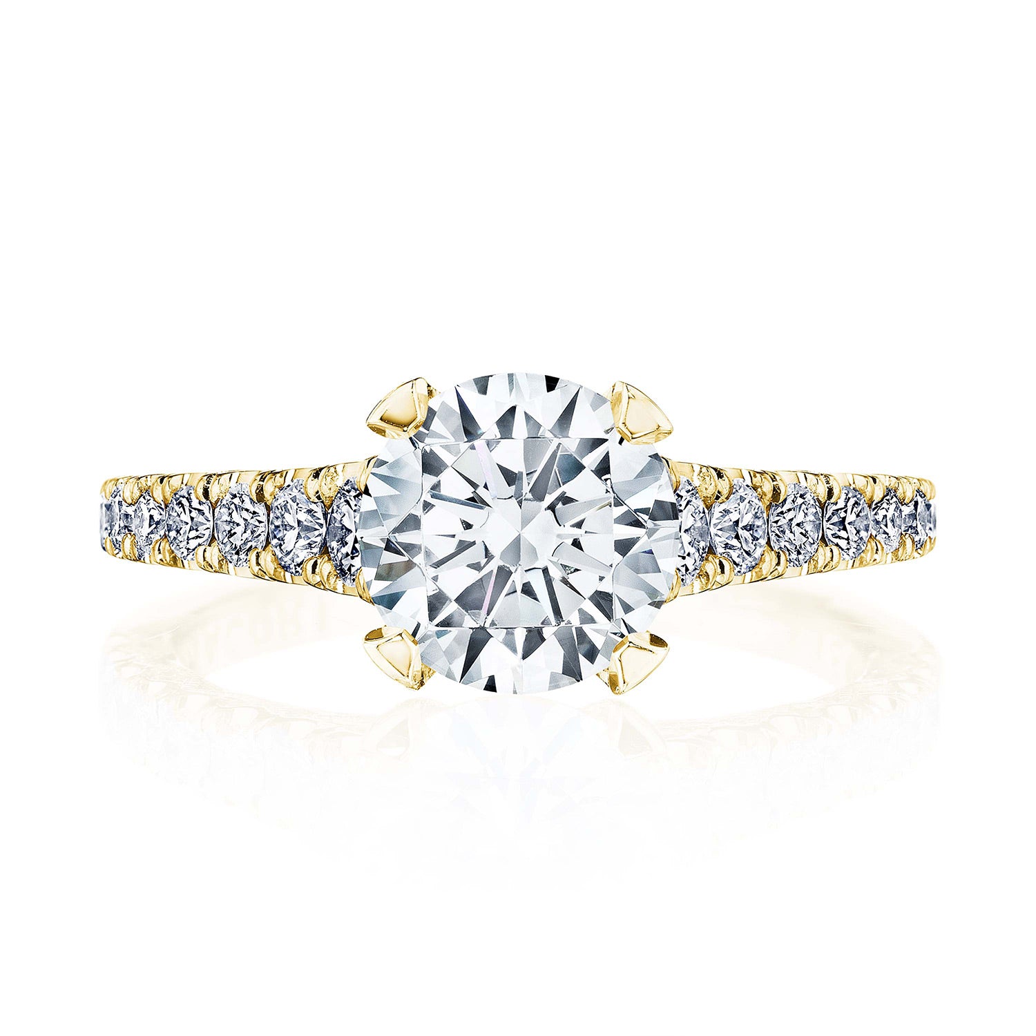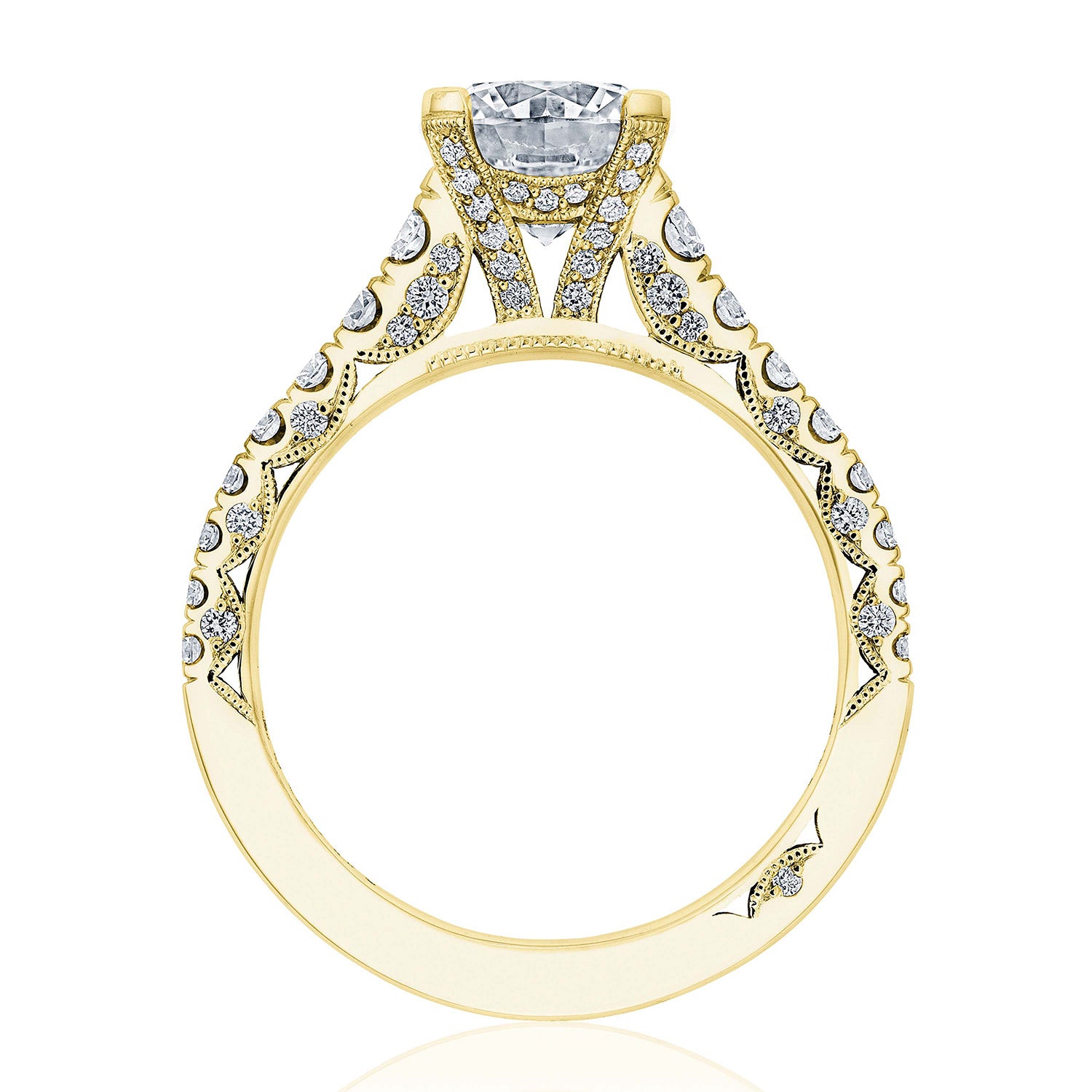 Tapering pavé-set diamonds lead up the ceiling towards the center stone, which is set on a diamond-studded Cathedral foundation above a hidden bloom and a band of Petite Crescent fabric. A Signature Crescent marks the foundation of the ring.