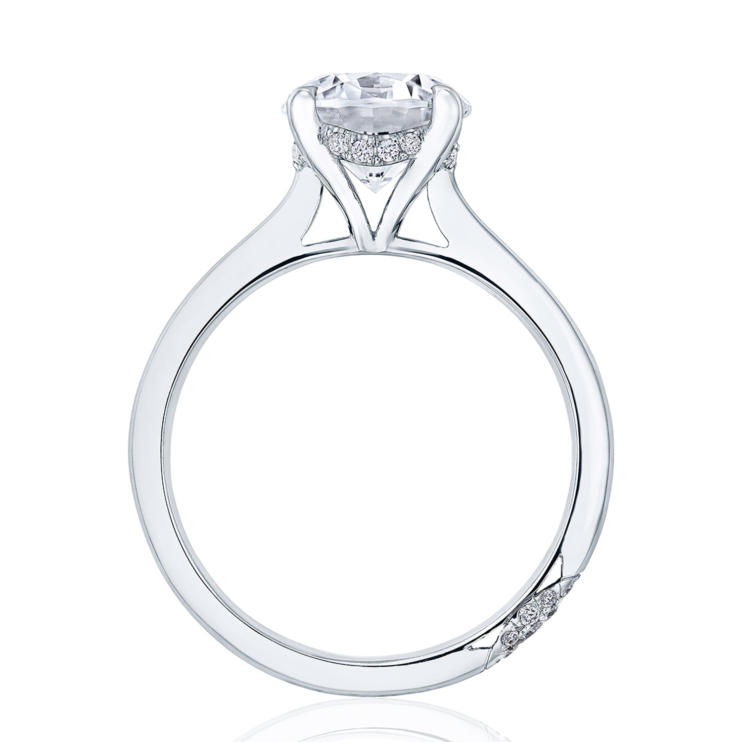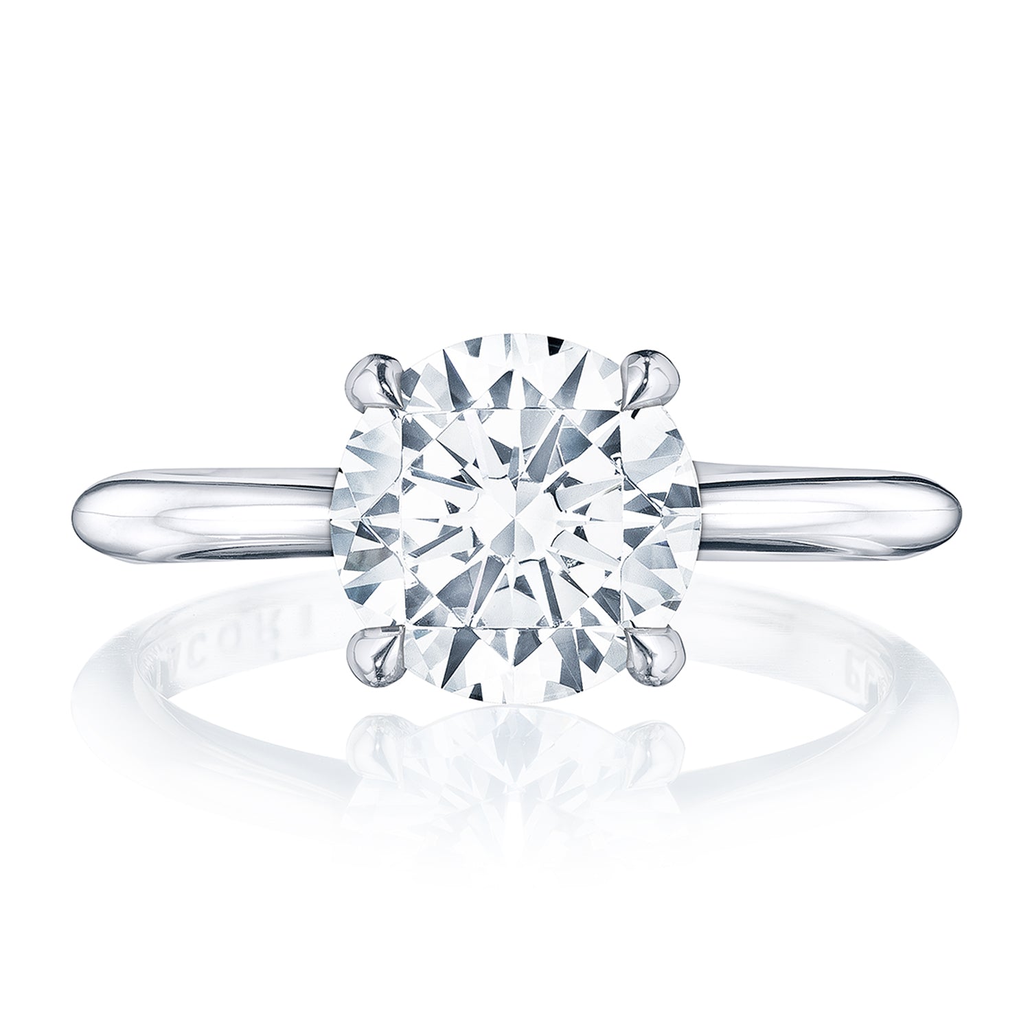 Designed by our Founder, Haig Tacorian, this stunning four-prong, solitaire engagement ring features a round-brilliant cut center stone on a high-polished band. Discover the hidden bloom of diamonds underneath the crown and the diamond-studded crescent signature at the foundation.